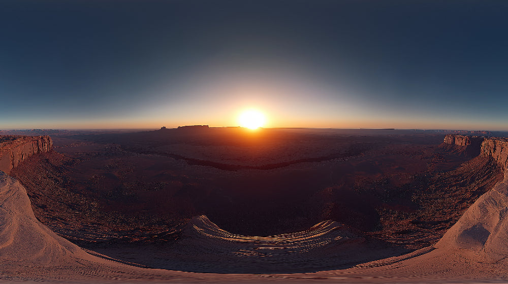 This desert landscape wallpaper captures nature's grand spectacle at its finest moment. The panoramic vista showcases a majestic sunrise emerging over vast canyon formations, painting the sky in rich gradients of deep blue to warm amber. The canyon wall mural reveals impressive rock formations stretching across the horizon, while the morning light casts long shadows across the rugged terrain, creating a scene of remarkable depth and dimension.