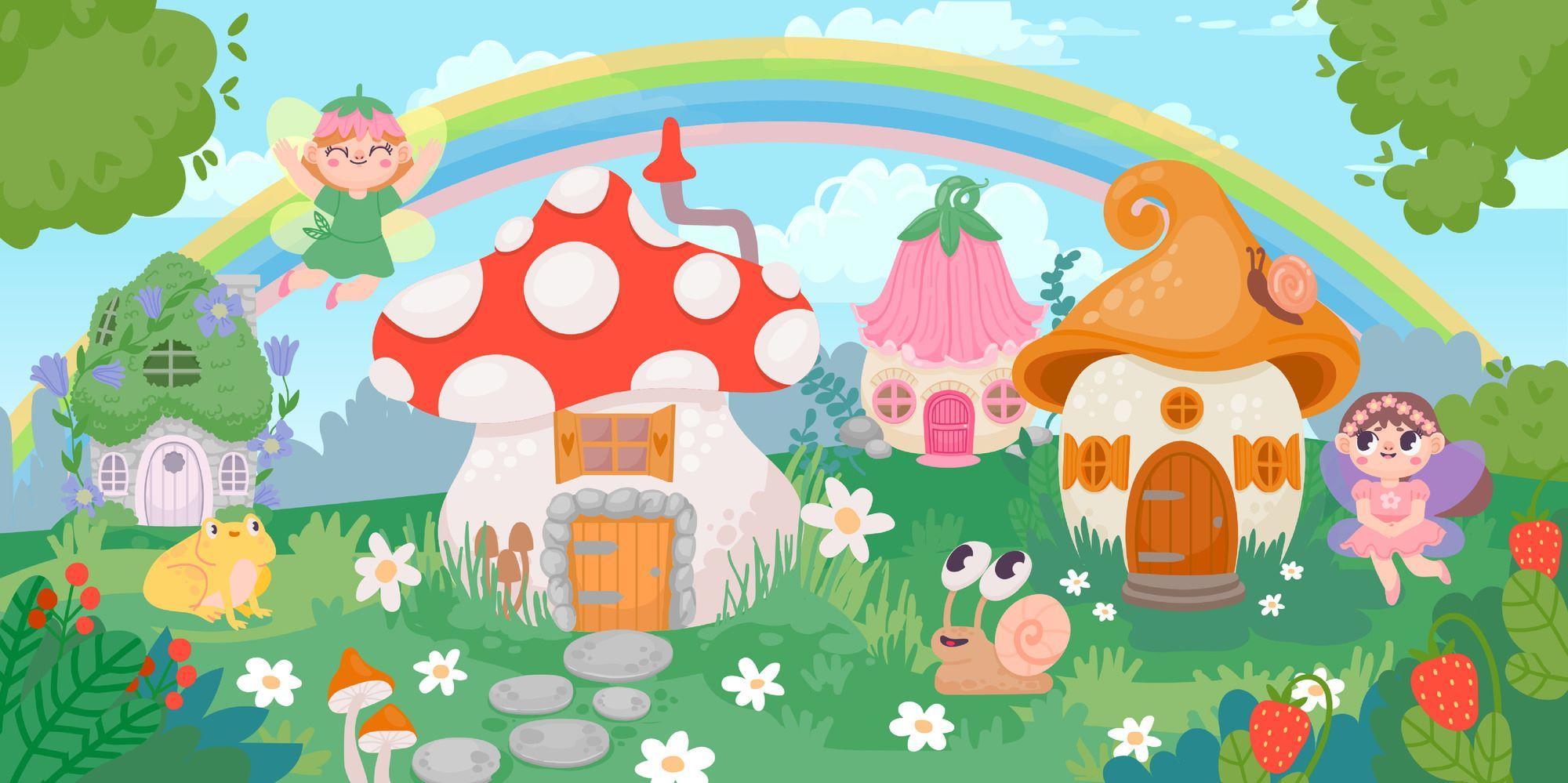 Fairy Garden Mural Wallpaper | Enchanted Mushroom Houses with Rainbow