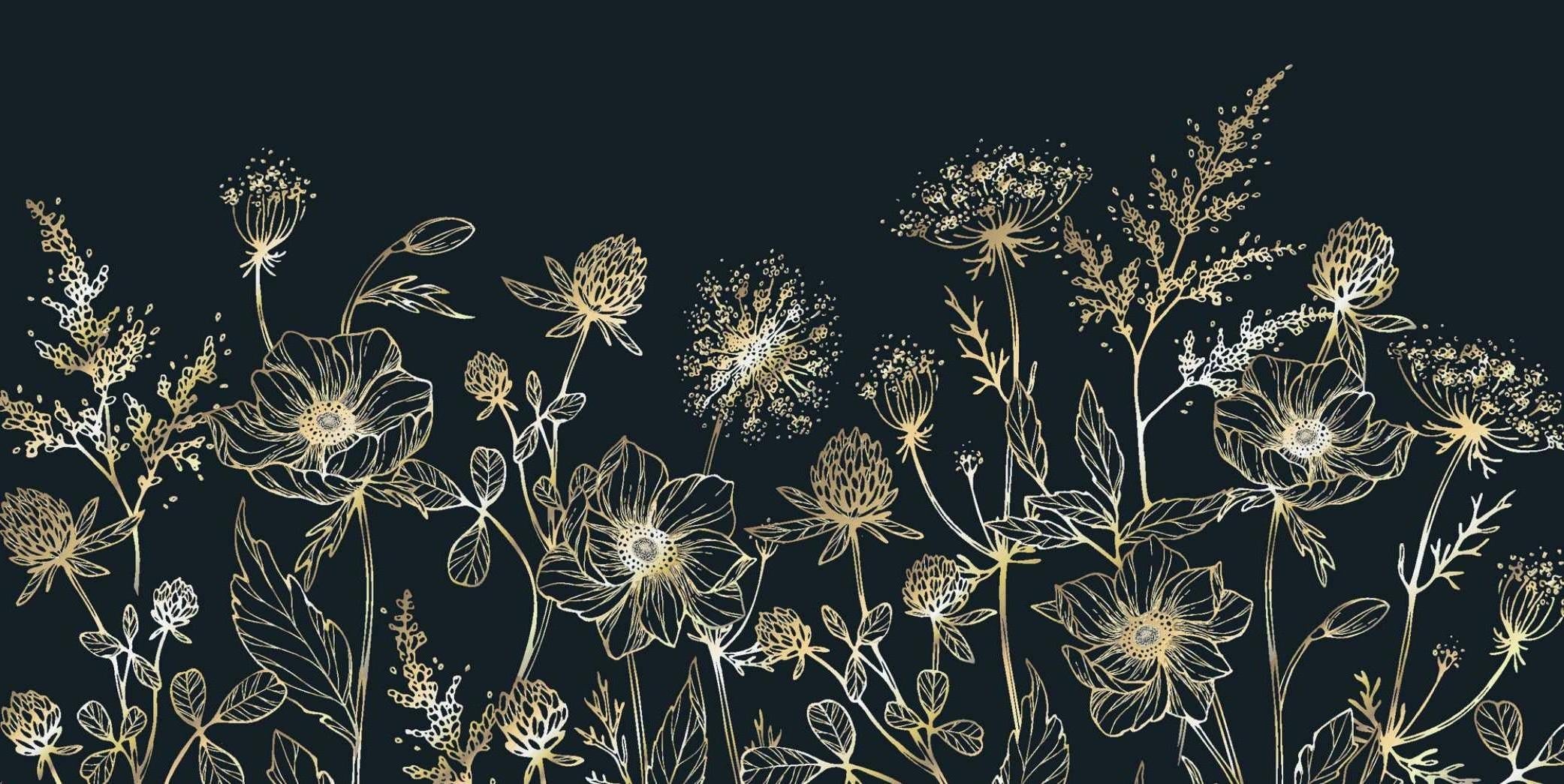 This botanical wallpaper mural showcases an enchanting garden of delicate wildflowers rendered in lustrous gold line art against a deep navy backdrop. Each bloom and stem is meticulously detailed, from graceful poppies to ethereal Queen Anne's lace, creating an artistic floral wall mural that appears to dance across the wall. The metallic golden accents catch and reflect light, adding dimension and movement to the sophisticated botanical composition.