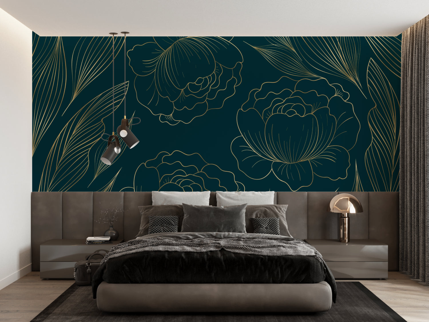 Floral Mural Wallpaper | Gold Line Art on Teal Background