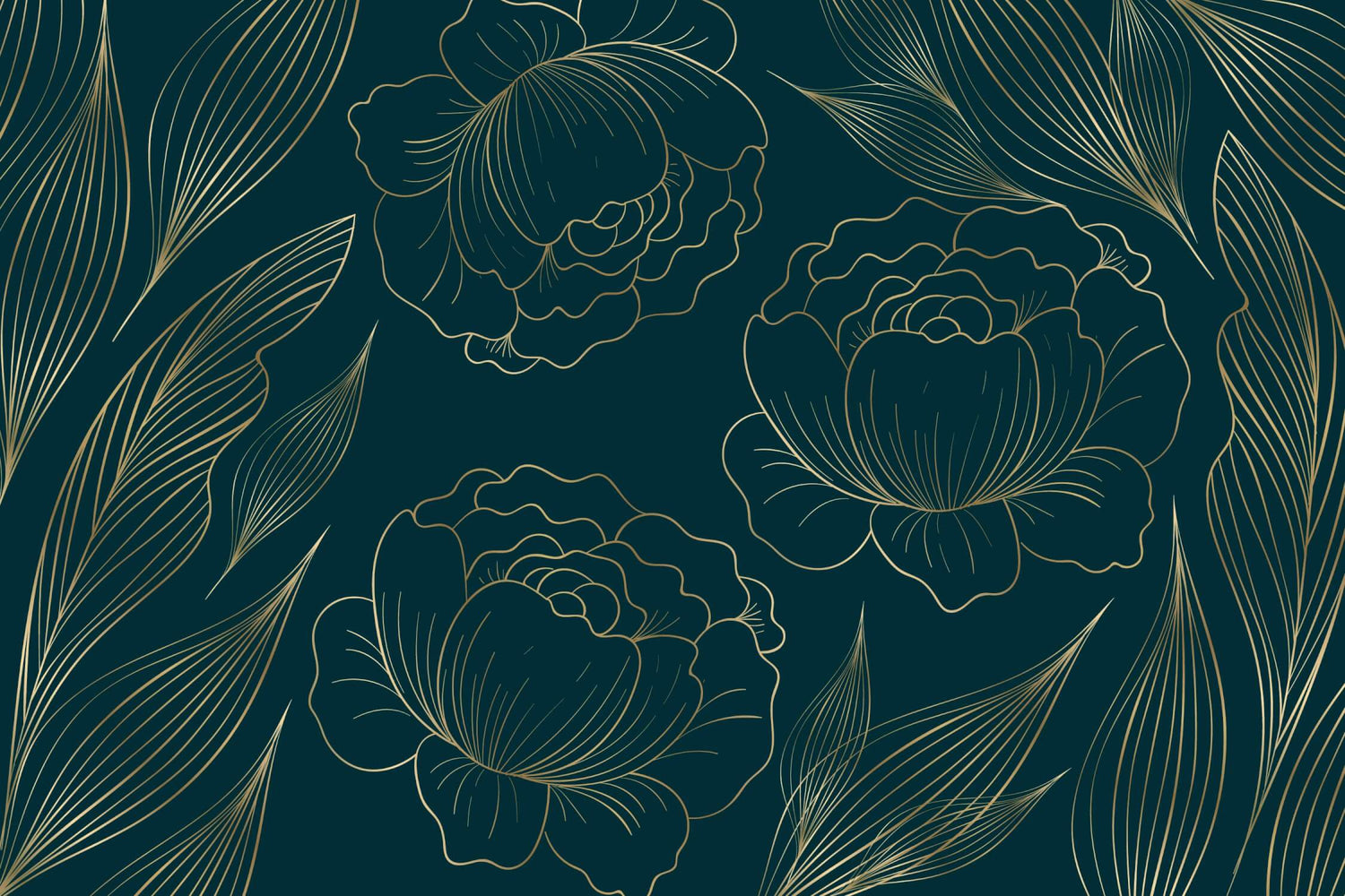 This luxury floral wallpaper showcases an elegant arrangement of oversized blooms rendered in sophisticated gold line art against a rich teal backdrop. The delicate hand-drawn quality of the golden floral pattern creates a striking balance between minimalist design and botanical grandeur, with graceful petals and leaves flowing across the surface in a continuous, rhythmic pattern that captivates the eye.