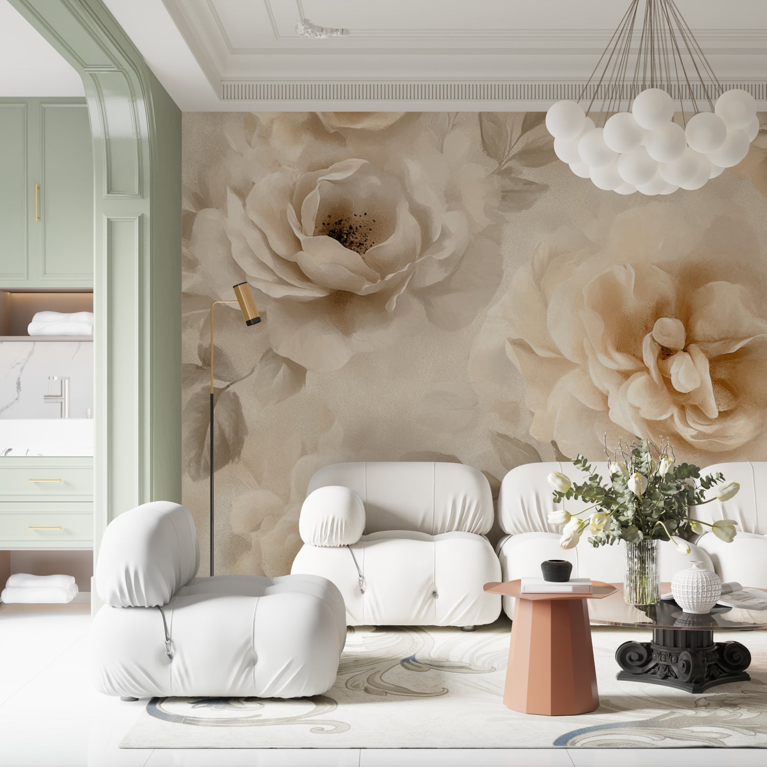 This beige floral wallpaper showcases magnificent oversized roses rendered in soft watercolor techniques. The delicate petals unfold in gentle cream and ivory tones, creating a sophisticated depth against the warm beige background. Each rose wall mural features intricate details, from the layered petals to the subtle dark centers, while ethereal foliage elements add an organic flow to the composition.