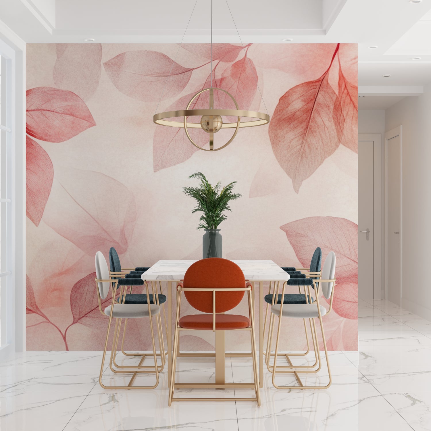 Transform your space with this pink leaf wallpaper that brings an air of refined tranquility to any interior. The gentle, flowing design works beautifully in both intimate and social spaces, while the modern botanical wallpaper creates a serene backdrop that enhances the architectural features of your room. The soft color palette promotes a sense of calm while maintaining a sophisticated aesthetic that complements various interior styles.