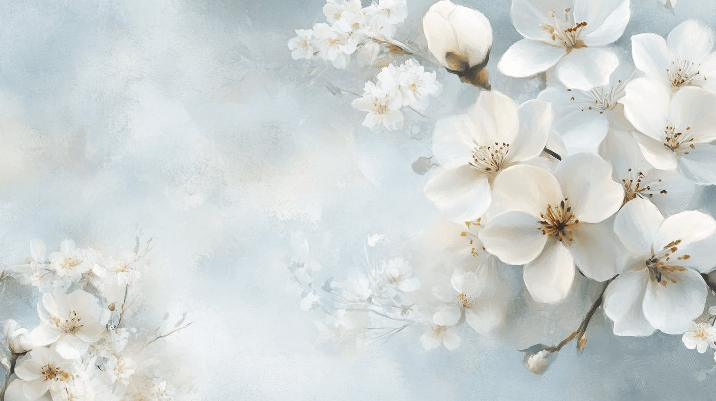 This cherry blossom wallpaper showcases delicate white blooms gracefully arranged against a soft blue-grey backdrop, creating an ethereal atmosphere of natural elegance. The floral wall mural captures the essence of spring with its pristine white petals and subtle golden stamens, while the watercolor technique adds depth and artistic sophistication to the overall composition.