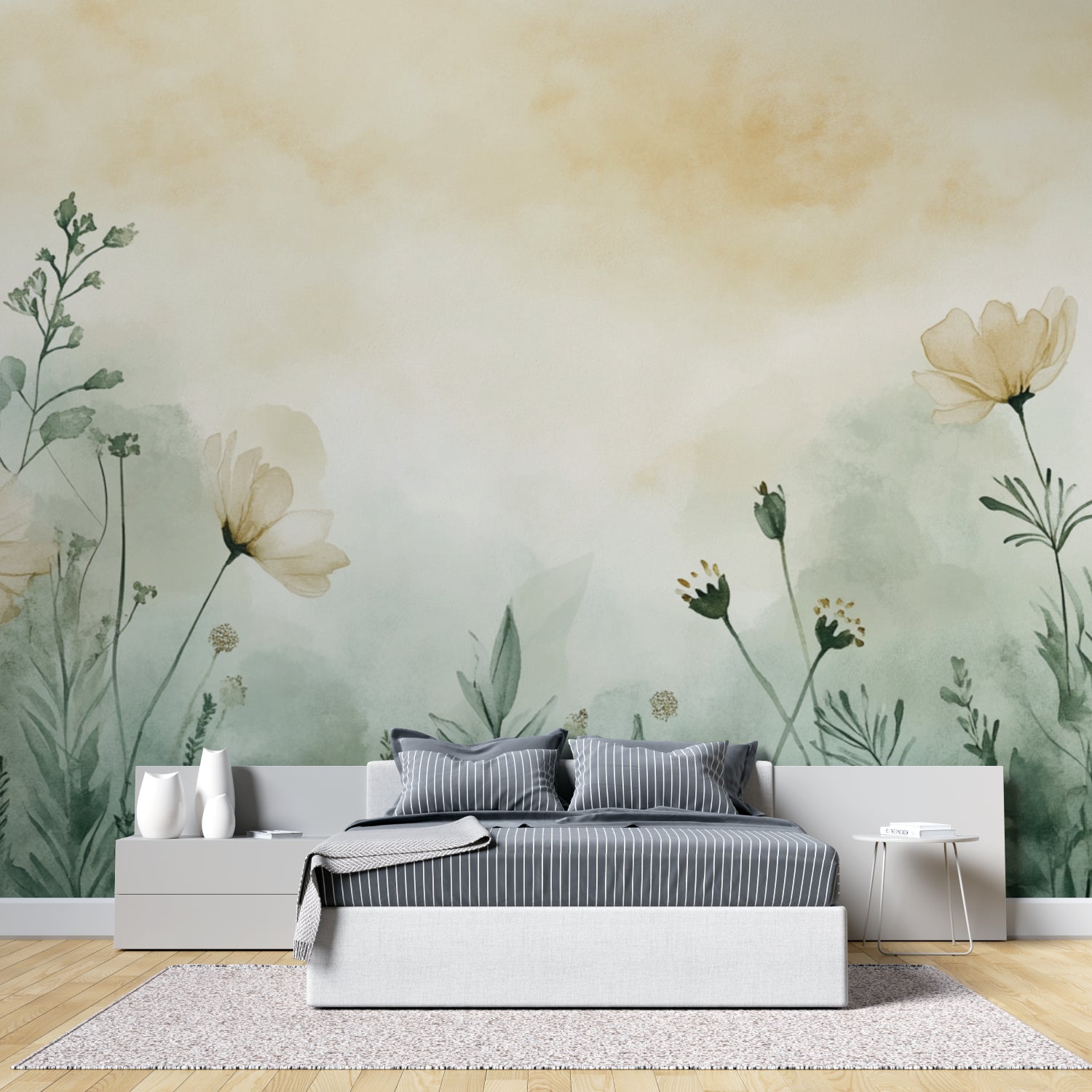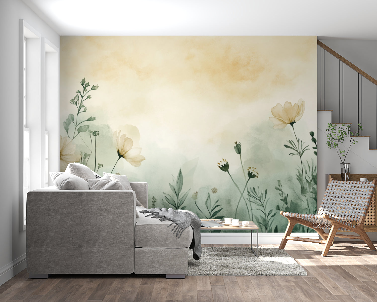 Transform your space with this watercolor floral wallpaper that brings the tranquility of a morning garden indoors. The subtle palette and botanical mural design create a sophisticated atmosphere that works harmoniously in any room, from serene bedrooms to elegant living spaces. The gentle color transitions and artistic composition offer a calming presence while adding depth and visual interest to your walls.