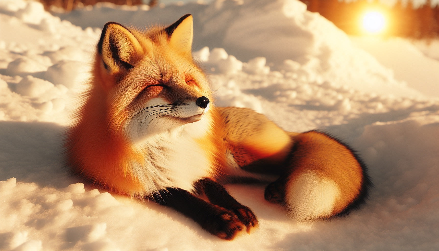 This forest fox wallpaper captures a serene moment of natural beauty, featuring a red fox basking in the warm glow of a winter sunset. The detailed portrayal showcases the fox's luxuriant fur in rich amber and cream tones, complemented by the pristine white snow surrounding it. The winter fox mural creates a captivating scene where golden sunlight bathes every detail, from the fox's content expression to its fluffy tail.
