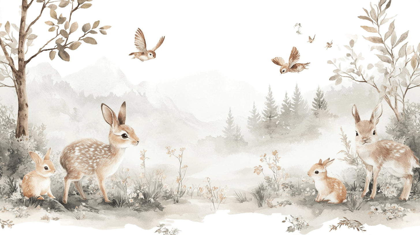 This enchanted forest wallpaper creates a serene woodland scene with delicate watercolor artistry. Gentle fawns and playful bunnies inhabit a misty landscape, while soft-winged birds soar through the ethereal atmosphere. The neutral palette of beige and gray tones, complemented by subtle pine trees and botanical elements, forms a forest animal wallpaper that captures nature's quiet grace.
