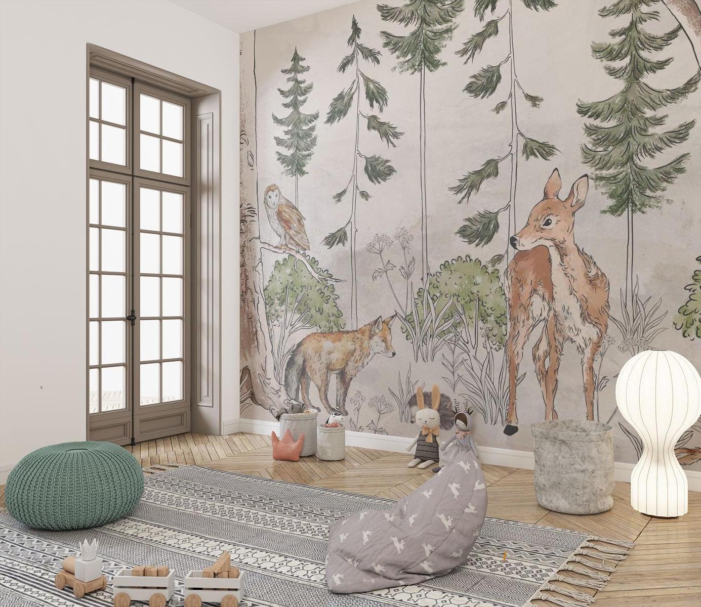 Transform any space into a tranquil forest sanctuary with this nature mural wallpaper. The sophisticated yet whimsical design makes it particularly suited for nurseries and children's rooms, while its refined artistic quality allows it to enhance any living space. This forest wall mural creates an atmosphere of natural serenity, bringing the peaceful essence of woodland life indoors while maintaining an elegant, contemporary aesthetic.