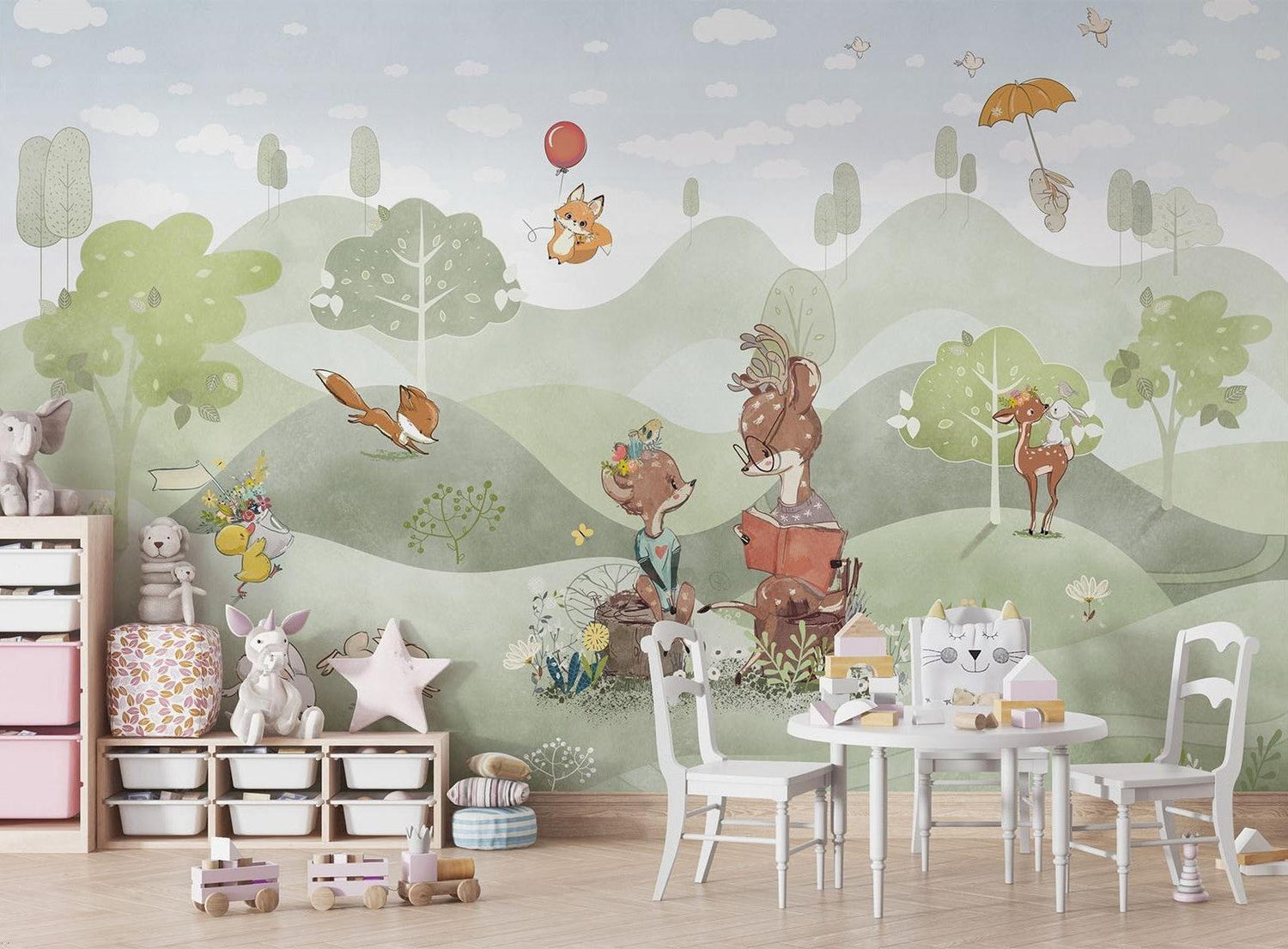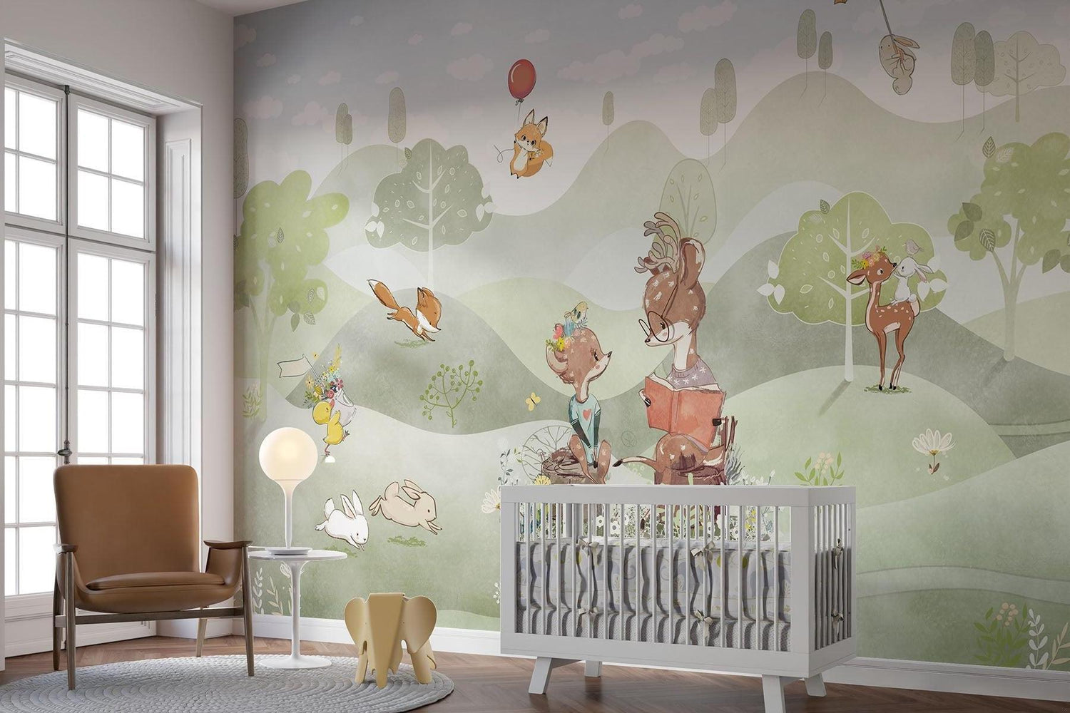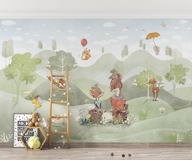 This enchanting forest animal wallpaper creates a storybook world where whimsy meets nature in perfect harmony. Set against rolling hills in soft sage-green tones, charming woodland creatures come to life in delicate watercolor style. A playful fox floats with a red balloon, while bears share a quiet moment amidst wildflowers, and a woodland nursery wallpaper scene unfolds with deer, rabbits, and birds dancing through the gentle landscape.