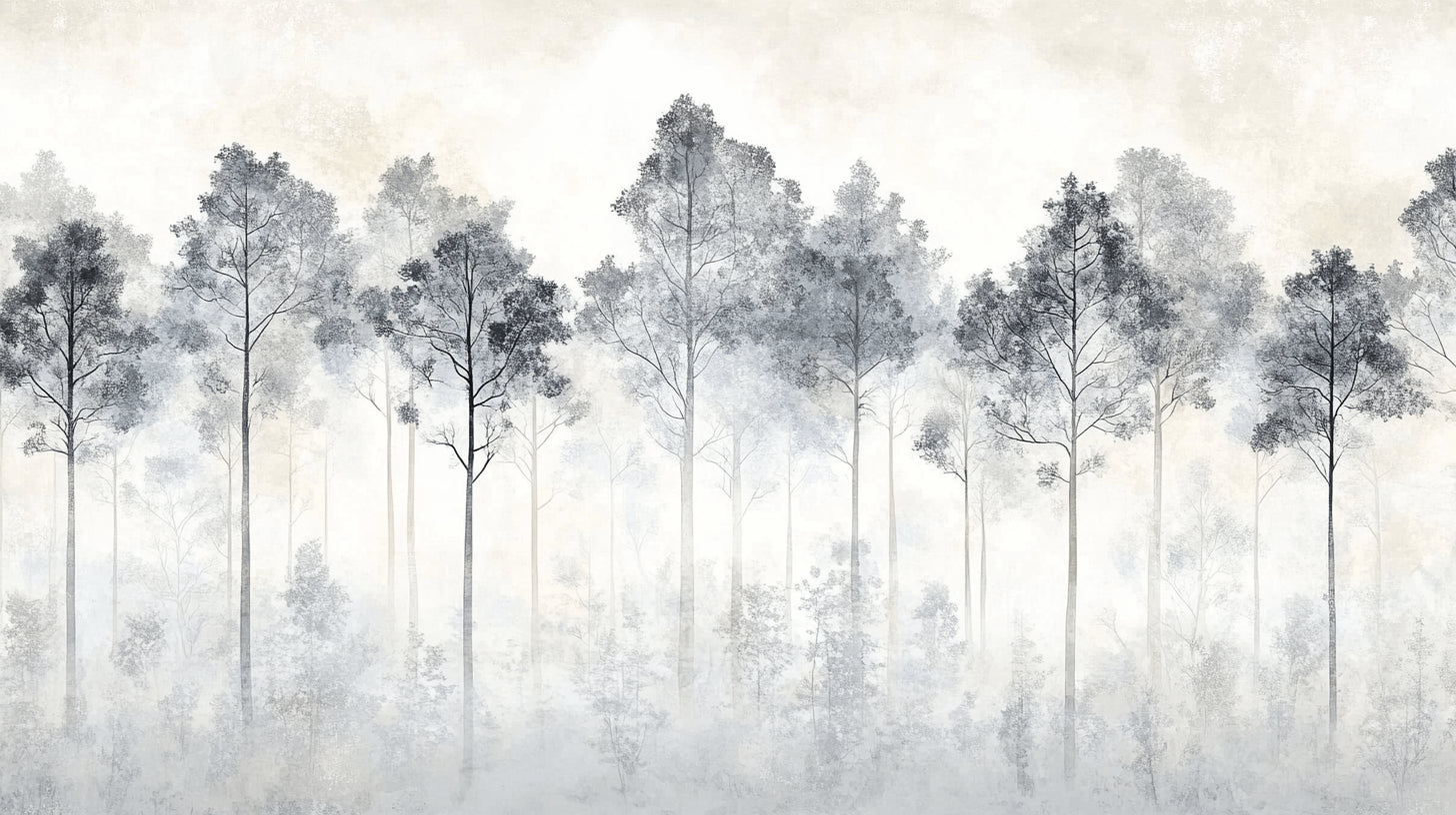 This forest wallpaper mural captures the ethereal beauty of tall trees emerging through a gentle morning mist. The sophisticated grey palette creates a serene atmosphere, with slender trunks rising majestically against a soft, foggy background. Each tree wallpaper element is masterfully rendered in various shades of grey, creating an enchanting depth that draws the eye into this peaceful woodland scene.