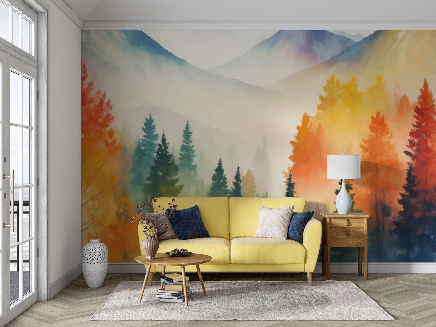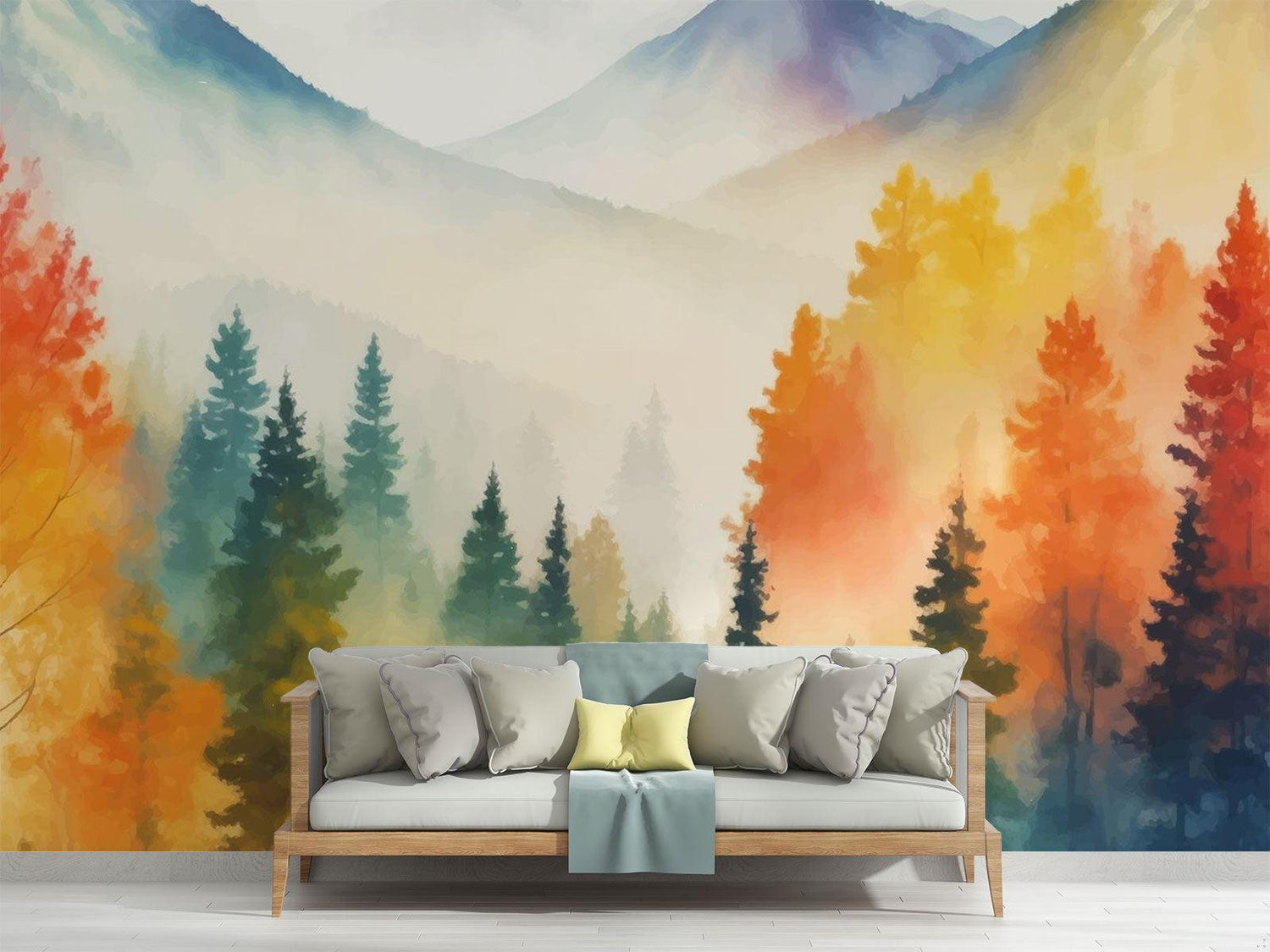 Forest Mural Wallpaper | Misty Mountain Watercolor Scene