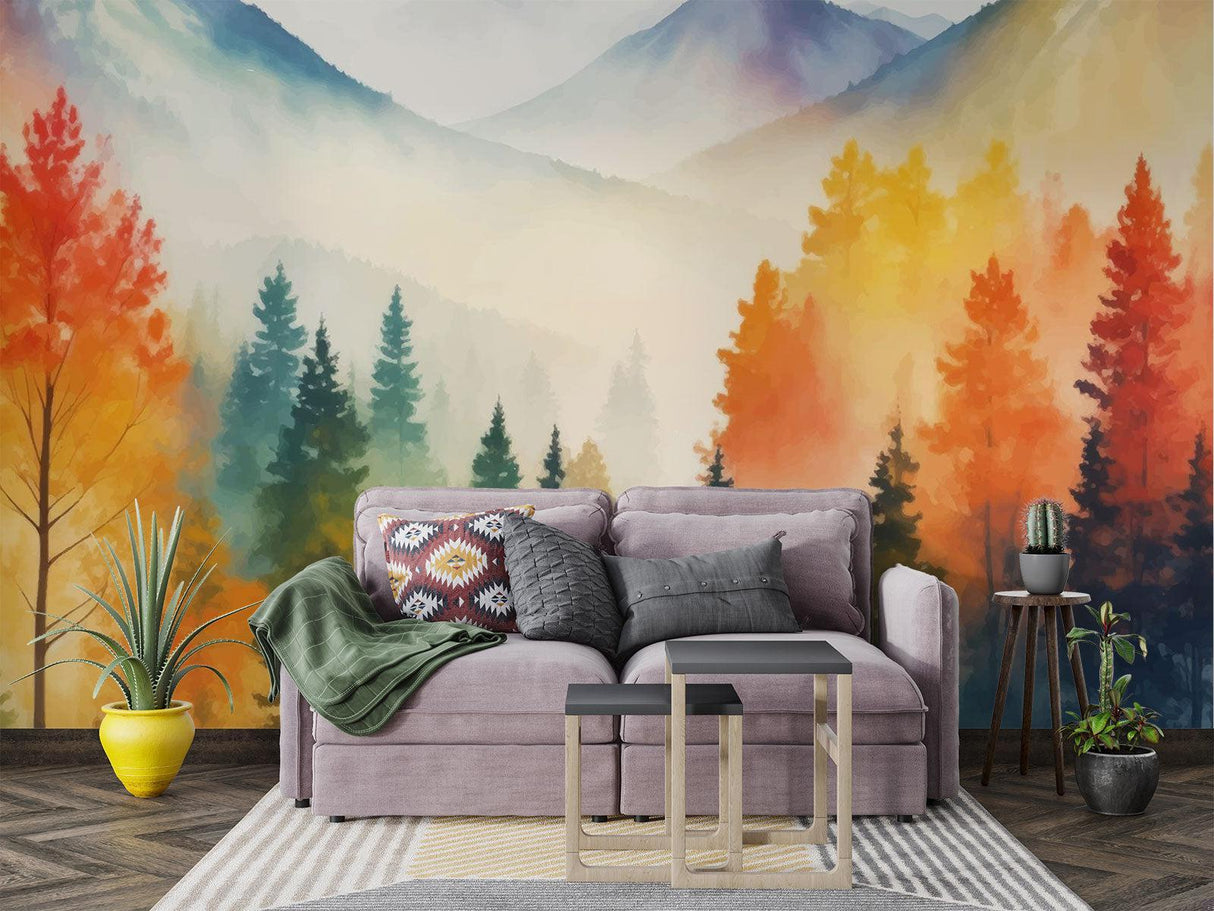 Transform your space with this watercolor forest mural that brings the tranquility of nature indoors. The pine forest wallpaper creates an immersive environment that works harmoniously in both contemporary and traditional settings, from living rooms to bedrooms. The artistic blend of warm and cool tones generates a balanced, serene atmosphere that makes any room feel more spacious and connected to the natural world.