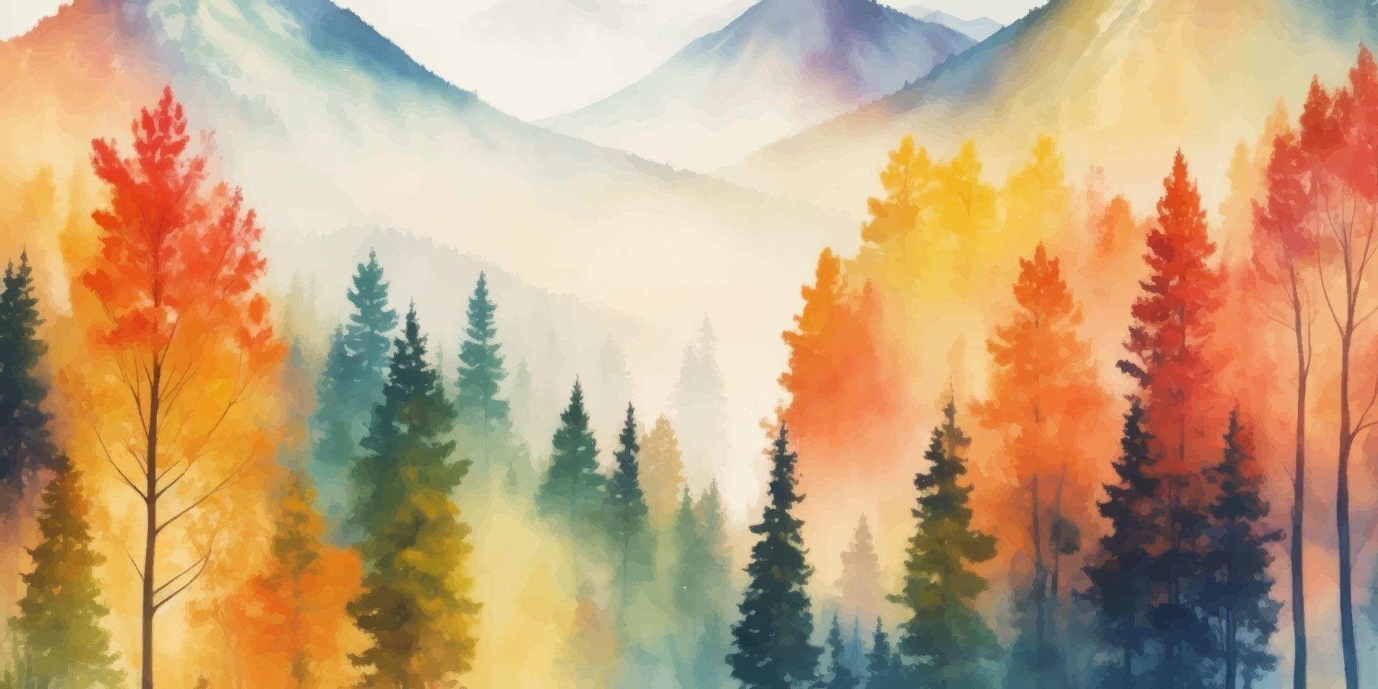 This enchanting mountain forest wallpaper captures the breathtaking beauty of nature in transition. Vibrant autumn trees in coral-red and golden-yellow hues stand sentinel against emerald pine forests, creating a captivating gradient of seasonal colors. The misty mountain landscape wallpaper features layers of distant peaks veiled in morning fog, rendered in delicate watercolor strokes that add depth and atmospheric perspective to the scene.