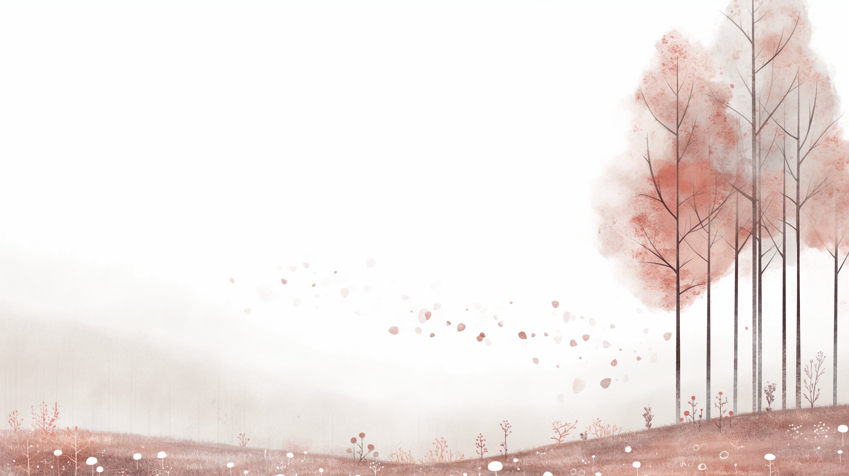 This minimalist forest wallpaper captures the essence of tranquility with its delicate watercolor composition. Gentle coral-pink trees emerge from a pristine white background, while scattered petals dance across the wall in a soft, ethereal movement. The artistic tree wallpaper combines subtle gradients and precise linework to create a masterful balance between presence and absence, structure and fluidity.