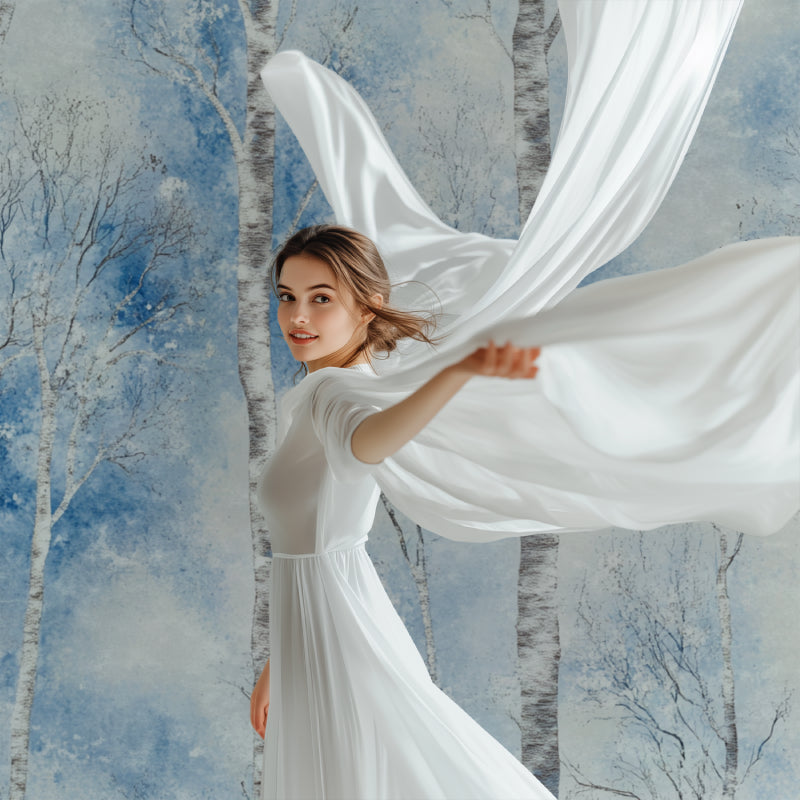 This winter forest wallpaper captures the serene beauty of silver birch trees set against a dreamy blue-and-white sky. The delicate branches reach upward through misty clouds, creating an ethereal atmosphere with their frost-kissed bark. Each birch tree wallpaper detail is rendered with remarkable precision, from the characteristic peeling bark to the subtle interplay of light and shadow among the winter branches.
