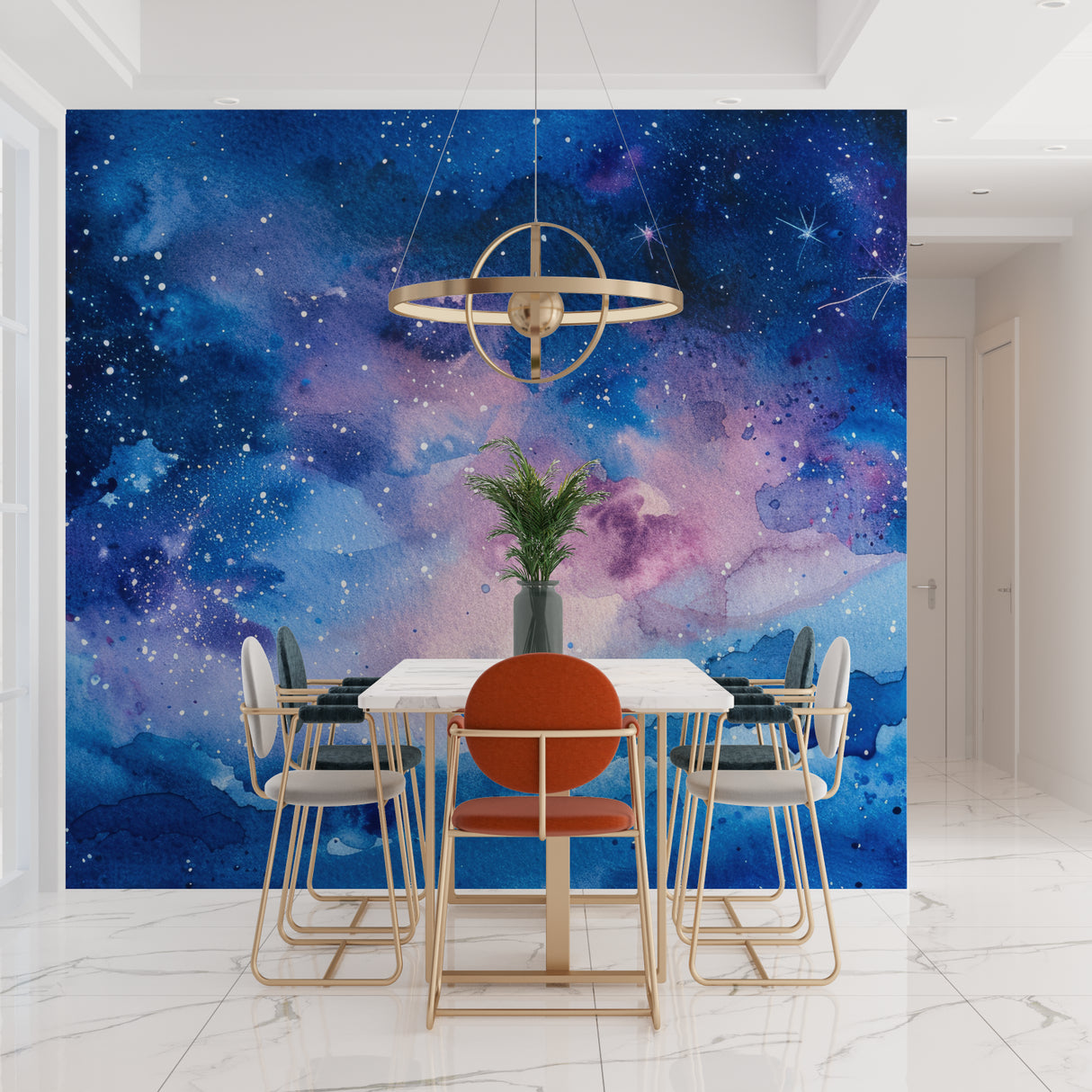 This cosmic wallpaper mural captures the enchanting beauty of a star-filled night sky through delicate watercolor artistry. Deep midnight blues blend seamlessly with ethereal purples and soft pink nebulas, creating a captivating celestial landscape. Each carefully placed star and cosmic detail in this galaxy wall mural brings the majesty of the universe into your space, while the watercolor technique adds a dreamy, artistic quality to the astronomical theme.