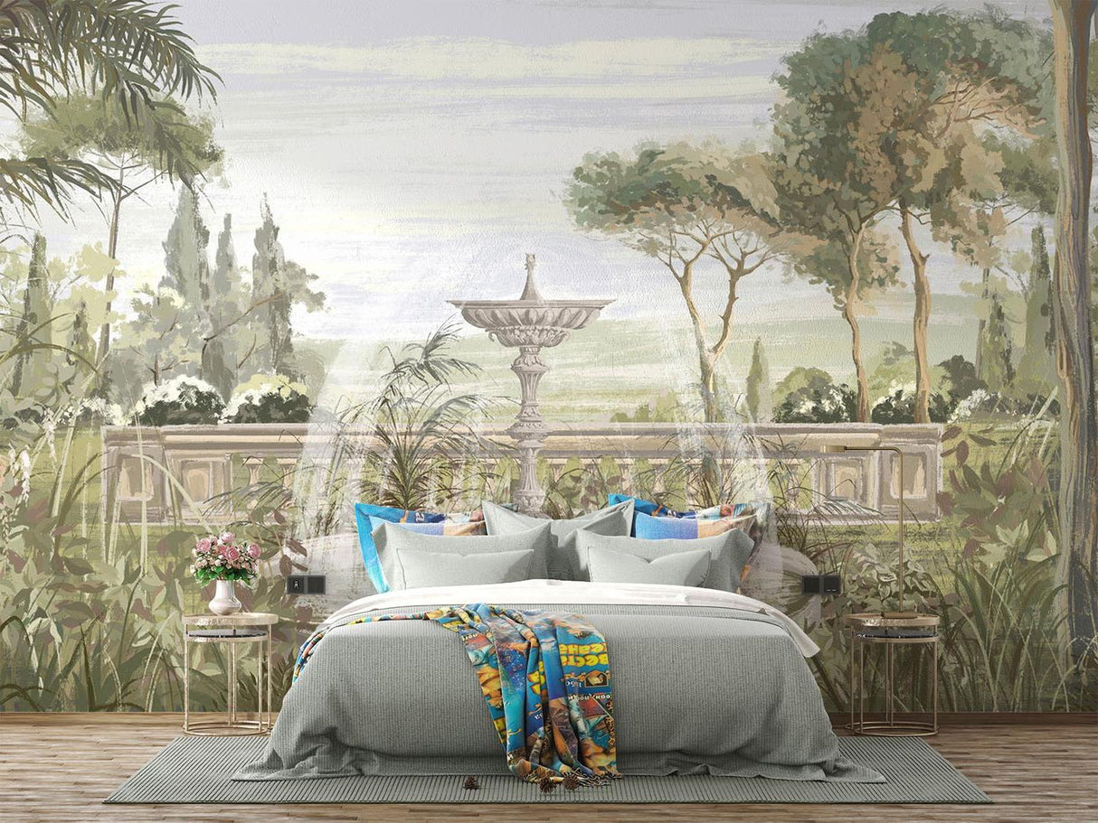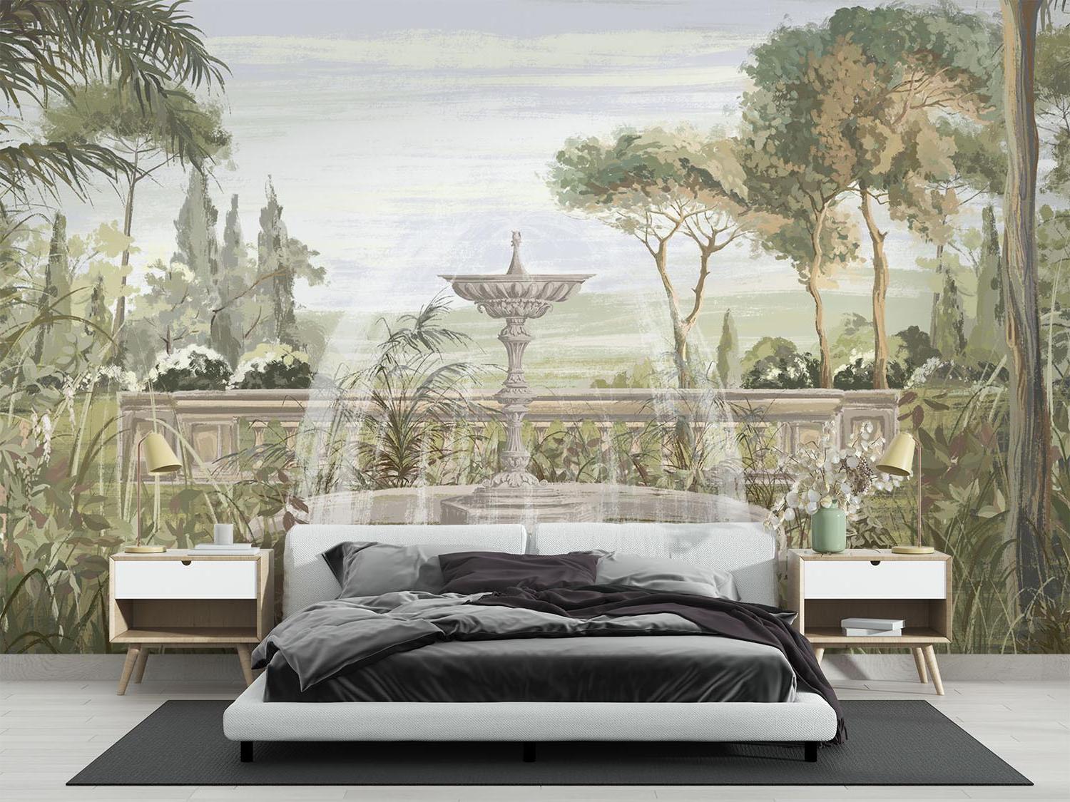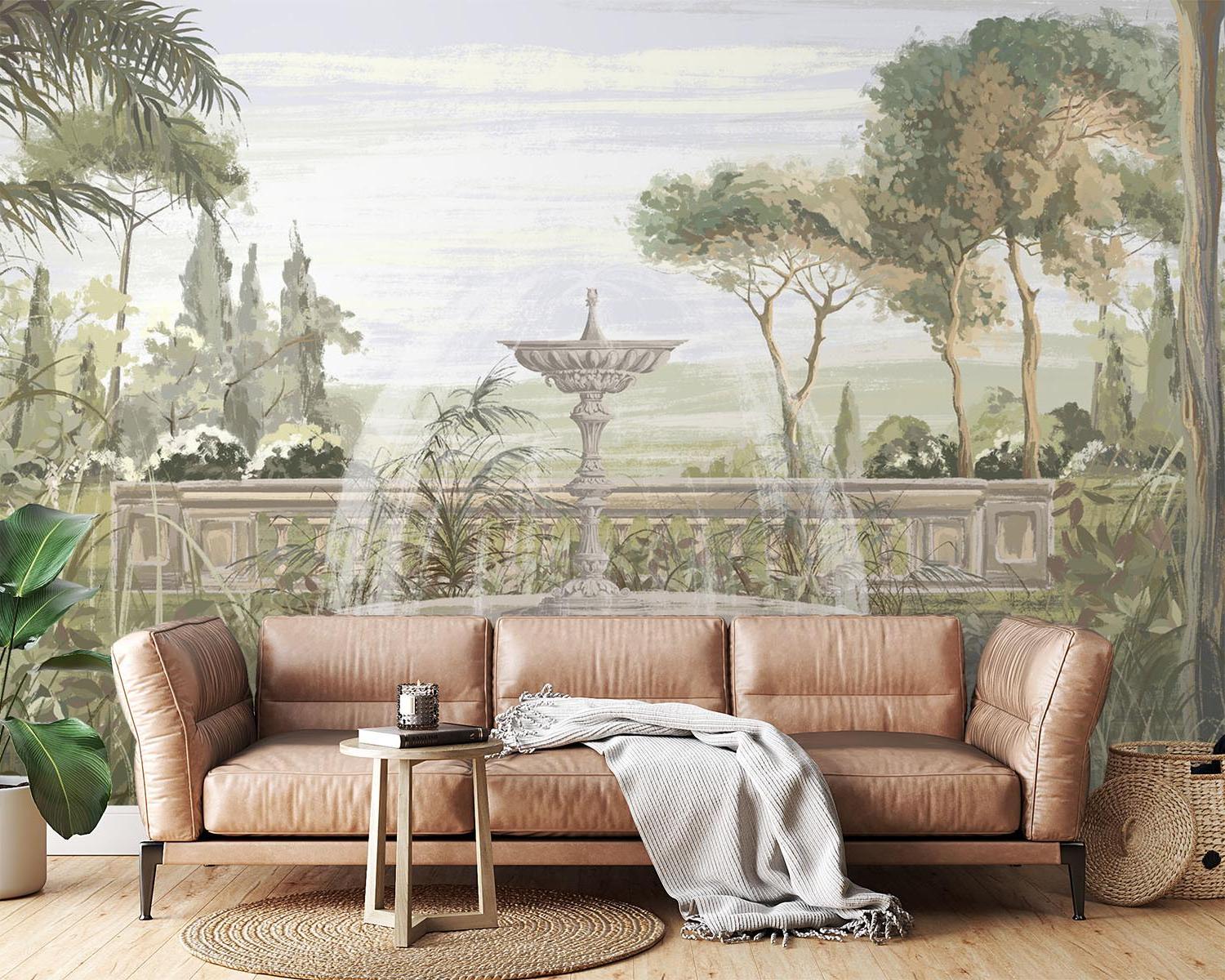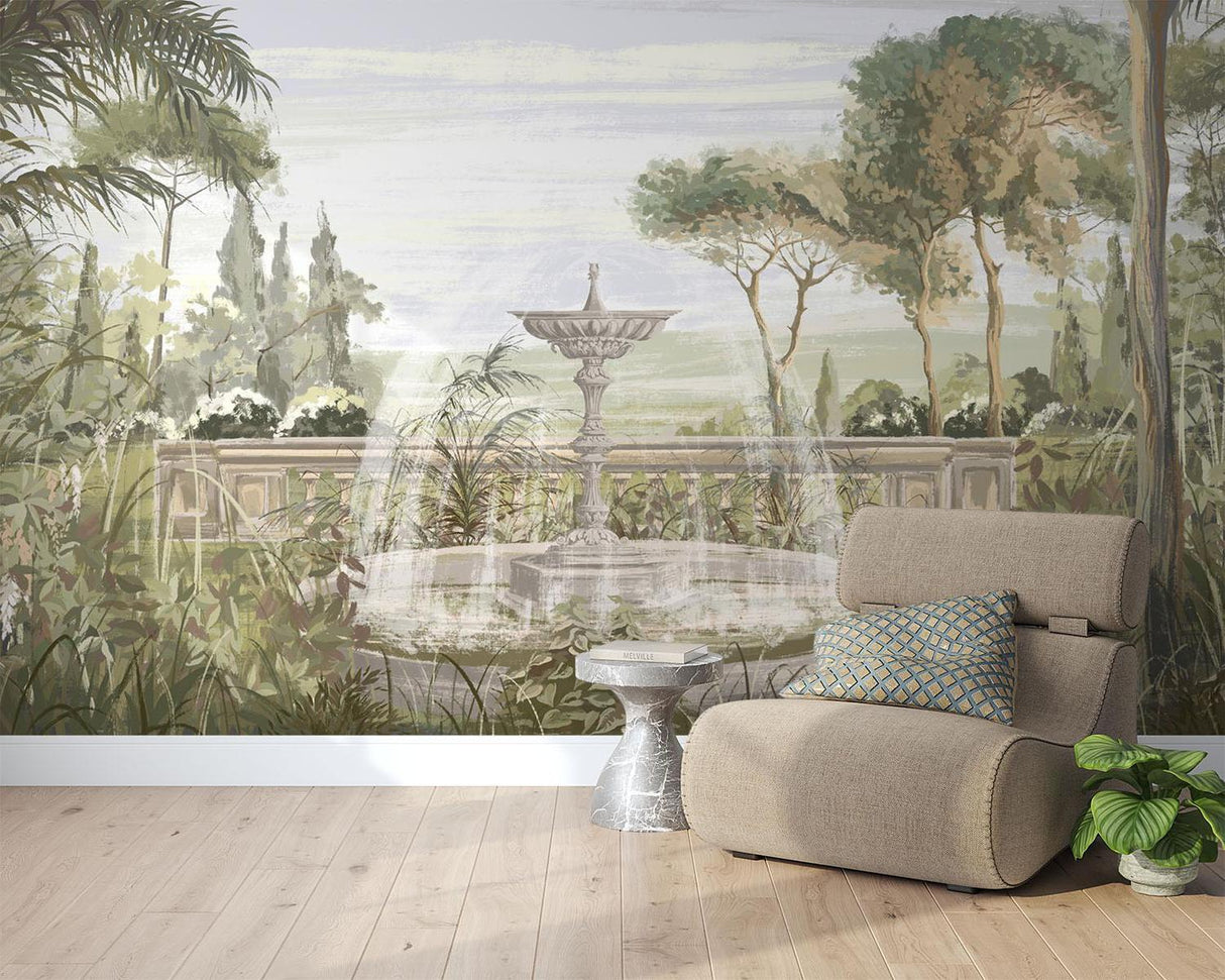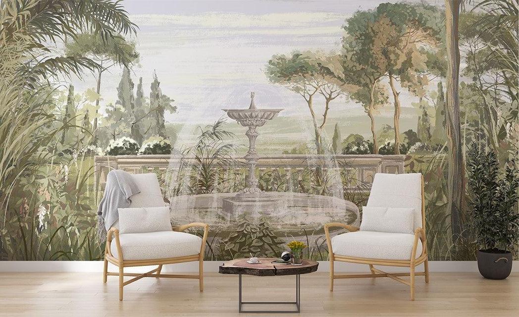 This garden landscape wallpaper captures the grandeur of a classical European garden, featuring an ornate stone fountain as its centerpiece. The scene unfolds in soft, watercolor-like strokes, where tall cypress trees and graceful palm fronds frame a balustrade terrace. The vintage garden mural employs a refined palette of sage greens, warm beiges, and misty grays, creating a depth that extends beyond the wall.