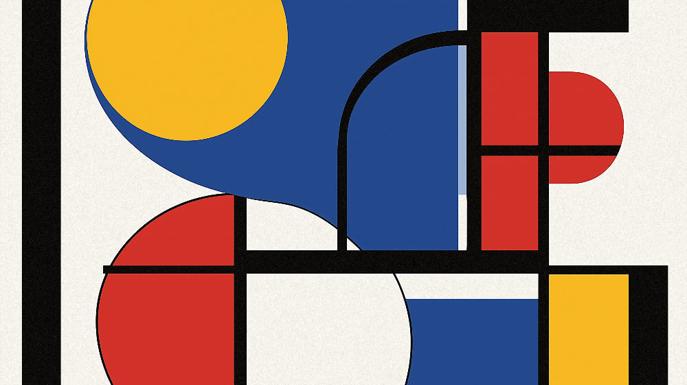 This geometric abstract wallpaper makes a bold artistic statement with its modernist composition of pure forms and primary colors. A large yellow circle floats against deep-blue shapes, while striking red segments create dynamic tension through the design. Black linear elements frame and divide the space with architectural precision, reflecting the Bauhaus-inspired wallpaper aesthetic that champions form and function.