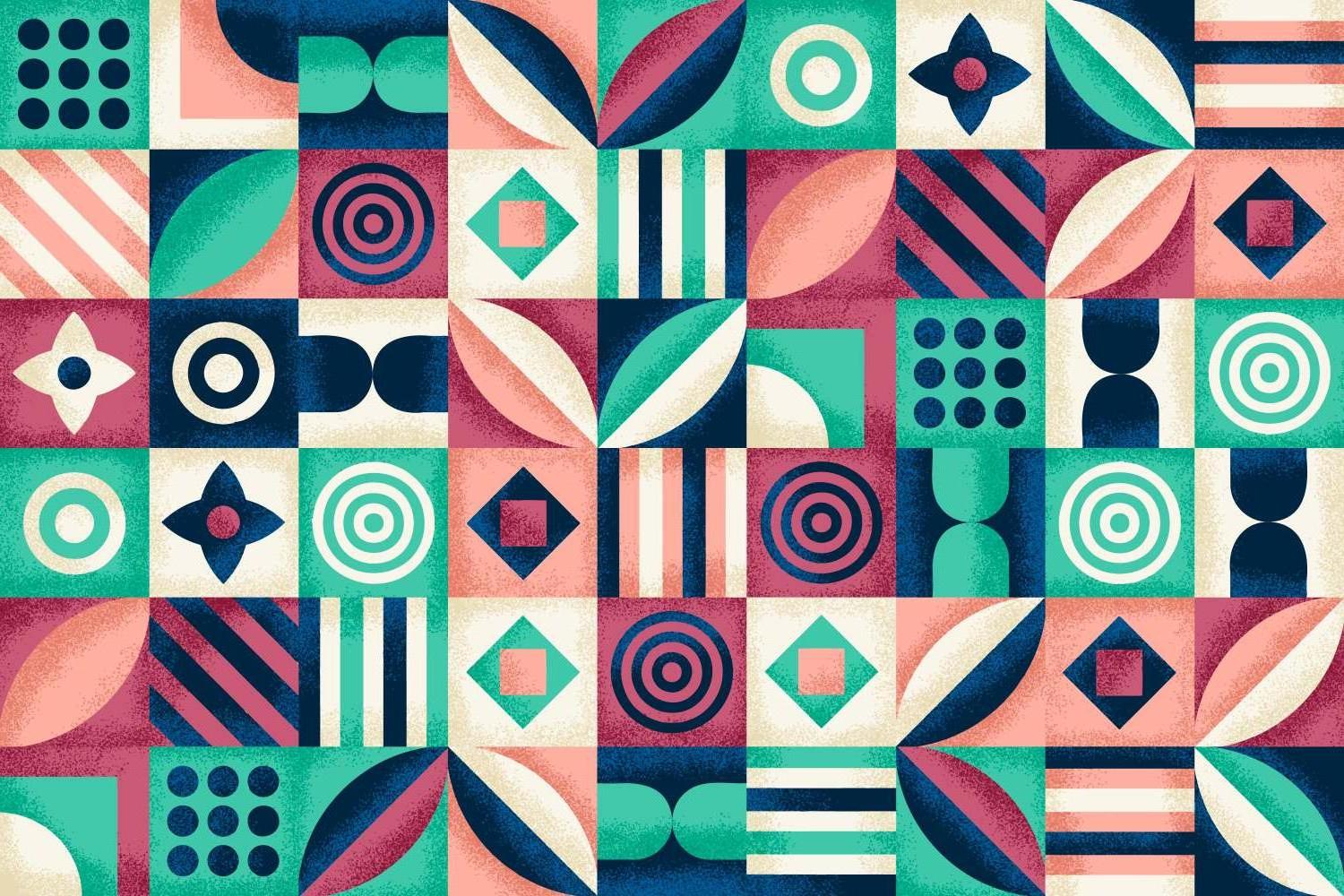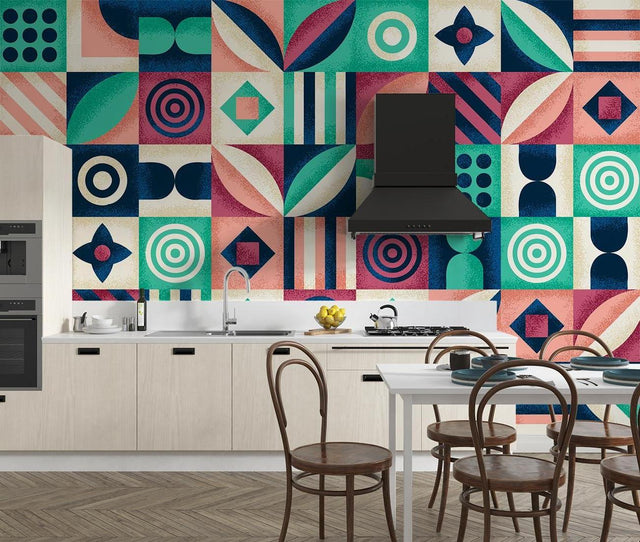 This geometric pattern wallpaper showcases a vibrant fusion of retro-modern design elements. The bold composition features an artful arrangement of circles, diamonds, and organic shapes in a harmonious blend of emerald green, navy blue, and coral pink tones. Each geometric element is thoughtfully textured with a subtle grain effect, while the modern geometric wallpaper creates a rhythmic pattern that captivates the eye with its balanced proportions and artistic precision.