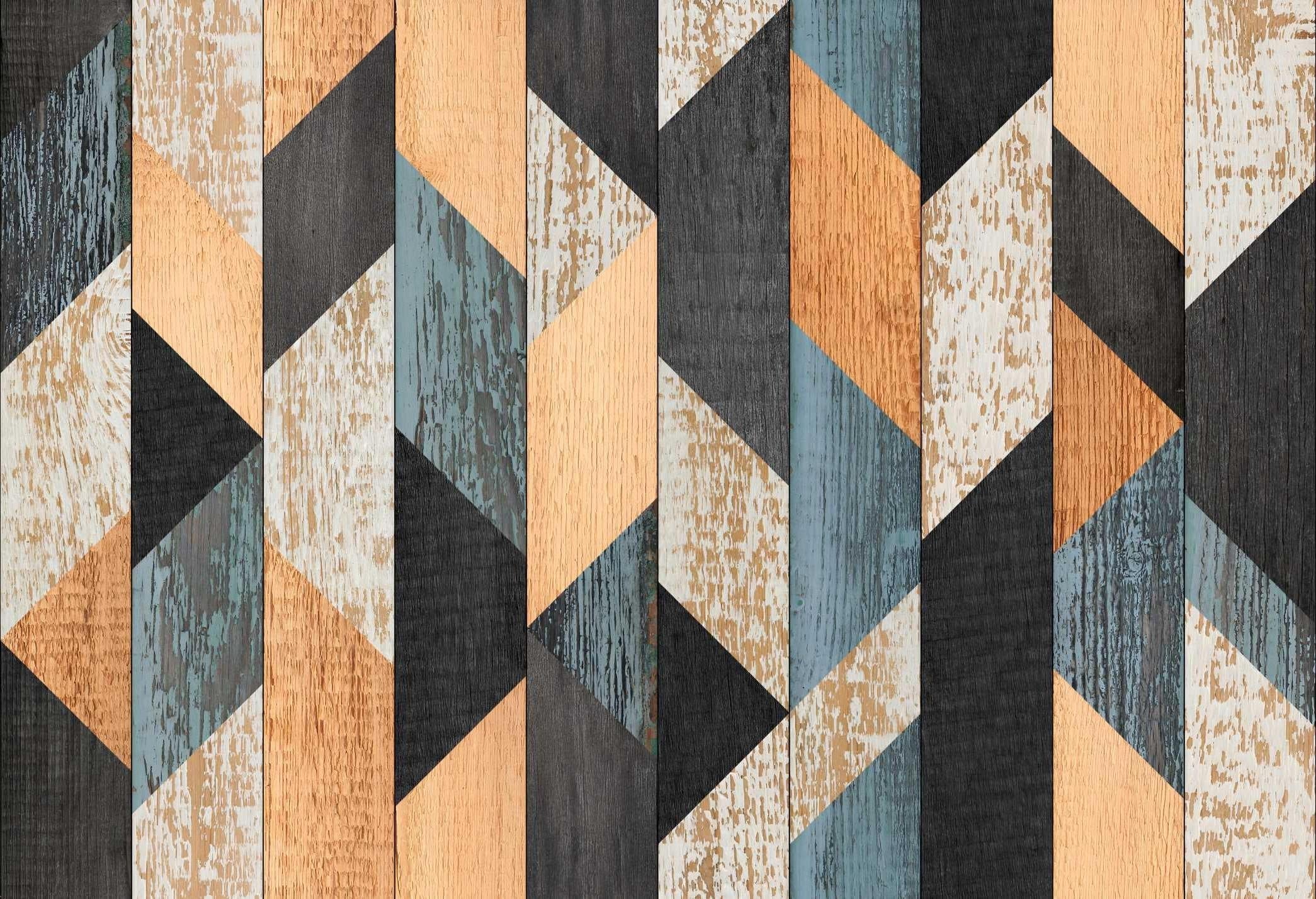 The unique blend of wood textures and modern geometric patterns creates a bold statement.