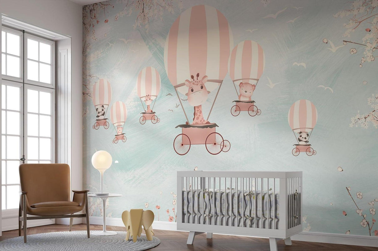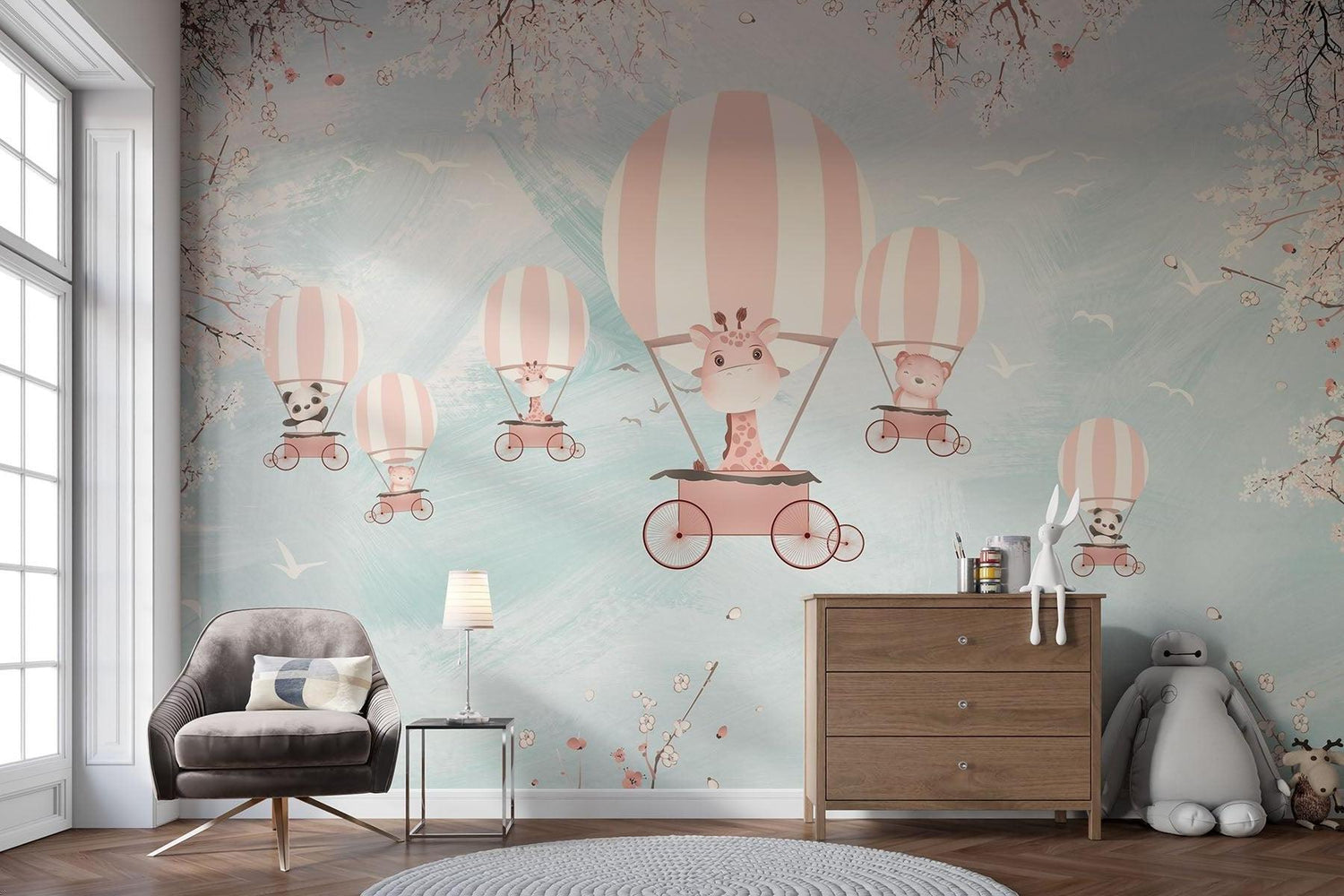 Hot Air Balloon Mural Wallpaper | Safari Animals Adventure with Cherry Blossoms