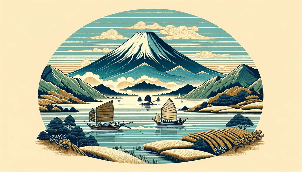 This Japanese mountain wallpaper captures an iconic view of Mount Fuji rising majestically above a serene lake landscape. The design showcases traditional wooden sailing boats gliding across tranquil waters, their distinctive silhouettes echoing ancient maritime traditions. Rendered in a harmonious palette of deep teals, soft beiges, and rich navy blues, this Mount Fuji wallpaper artfully combines precise linework with stylized clouds and terraced fields in classic Japanese artistic tradition.