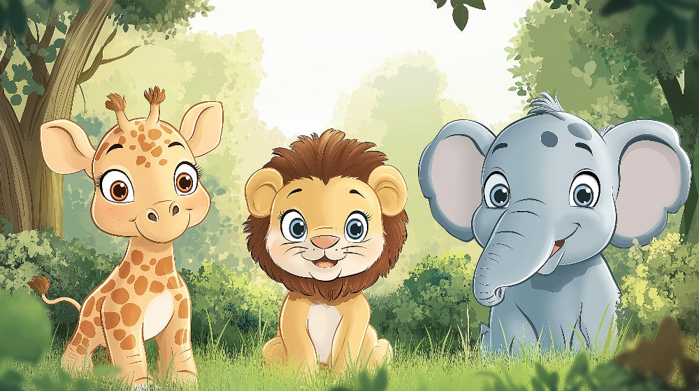 This enchanting jungle animals wallpaper brings a charming safari adventure to life with three adorable characters set against a lush forest backdrop. A gentle giraffe with spotted patterns, a friendly lion cub with a fluffy mane, and a cheerful elephant create a heartwarming safari wallpaper scene. The soft-green foliage and dreamy atmosphere provide a gentle, nature-inspired setting that captures the imagination of young minds.