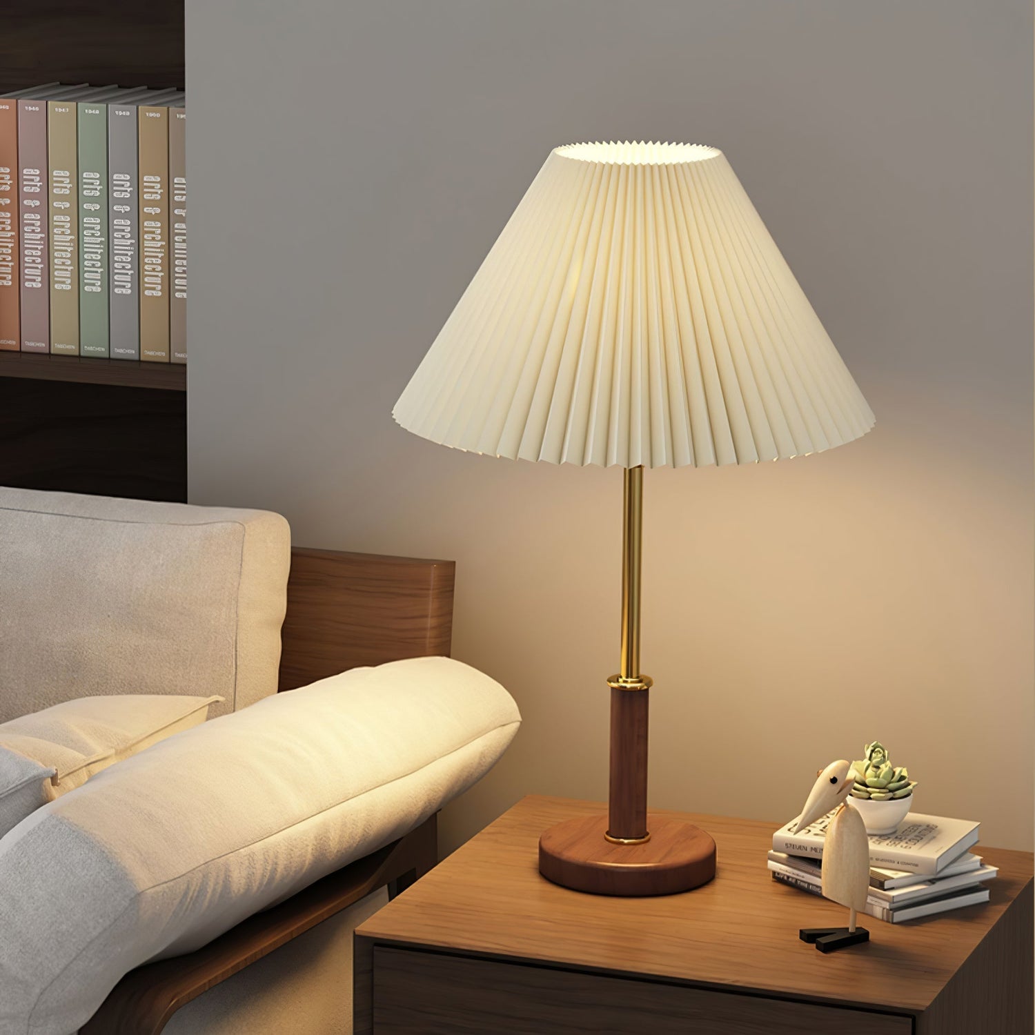 Mid-Century Table Lamp | Pleated Linen Shade with Gold & Walnut Base