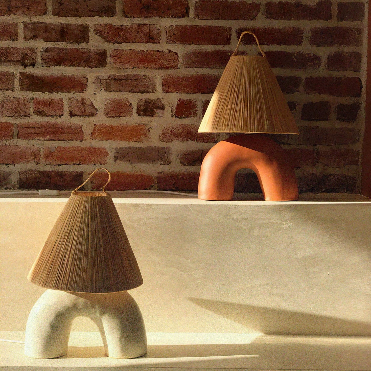 The ceramic table lamp, with its distinctive base and upward arms, almost seems to come to life. Accentuated by a raw raffia lampshade, each piece is handcrafted in a workshop in Barcelona, Spain. This modern table lamp uses clay to design practical handmade pieces that add depth and warmth to any room. The designs are made to preserve the natural qualities of the clay while showcasing beauty.