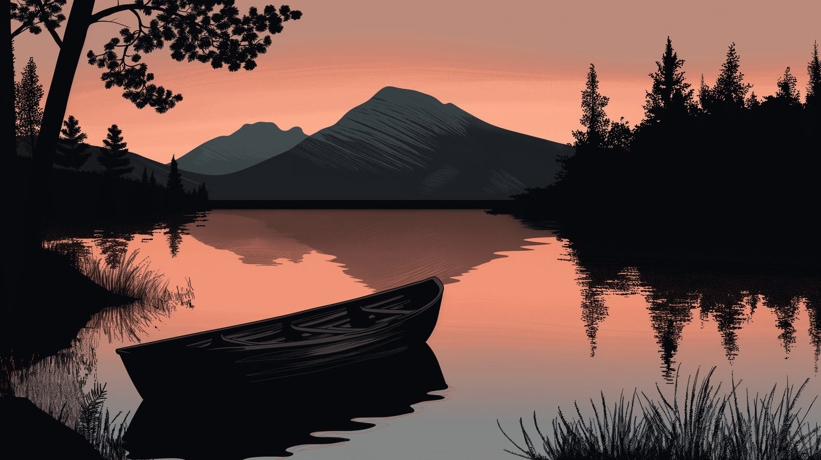 This mountain lake wallpaper captures the essence of a serene wilderness at dusk, where majestic peaks rise against a rose-gold sky. The composition showcases a dramatic silhouette of pine-covered shores and mountainous terrain, while a solitary black canoe anchors the foreground on mirror-like waters. The sunset landscape mural employs a sophisticated palette of coral-pink hues and deep charcoal tones, creating a captivating interplay of light and shadow.