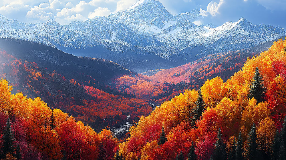 This mountain landscape wallpaper captures nature's most dramatic seasonal display, where snow-capped peaks rise majestically above a valley ablaze with autumn colors. The composition presents a breathtaking contrast between the crisp blue-white mountains and the warm palette of the forest below, where autumn foliage wallpaper showcases spectacular golden yellows and deep crimsons. A winding river threads through the valley, adding depth and movement to this stunning panoramic scene.