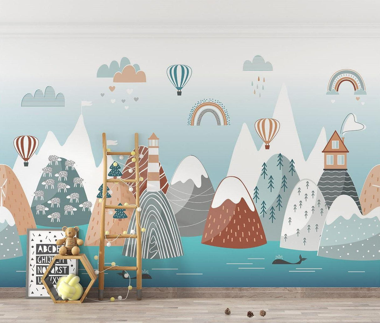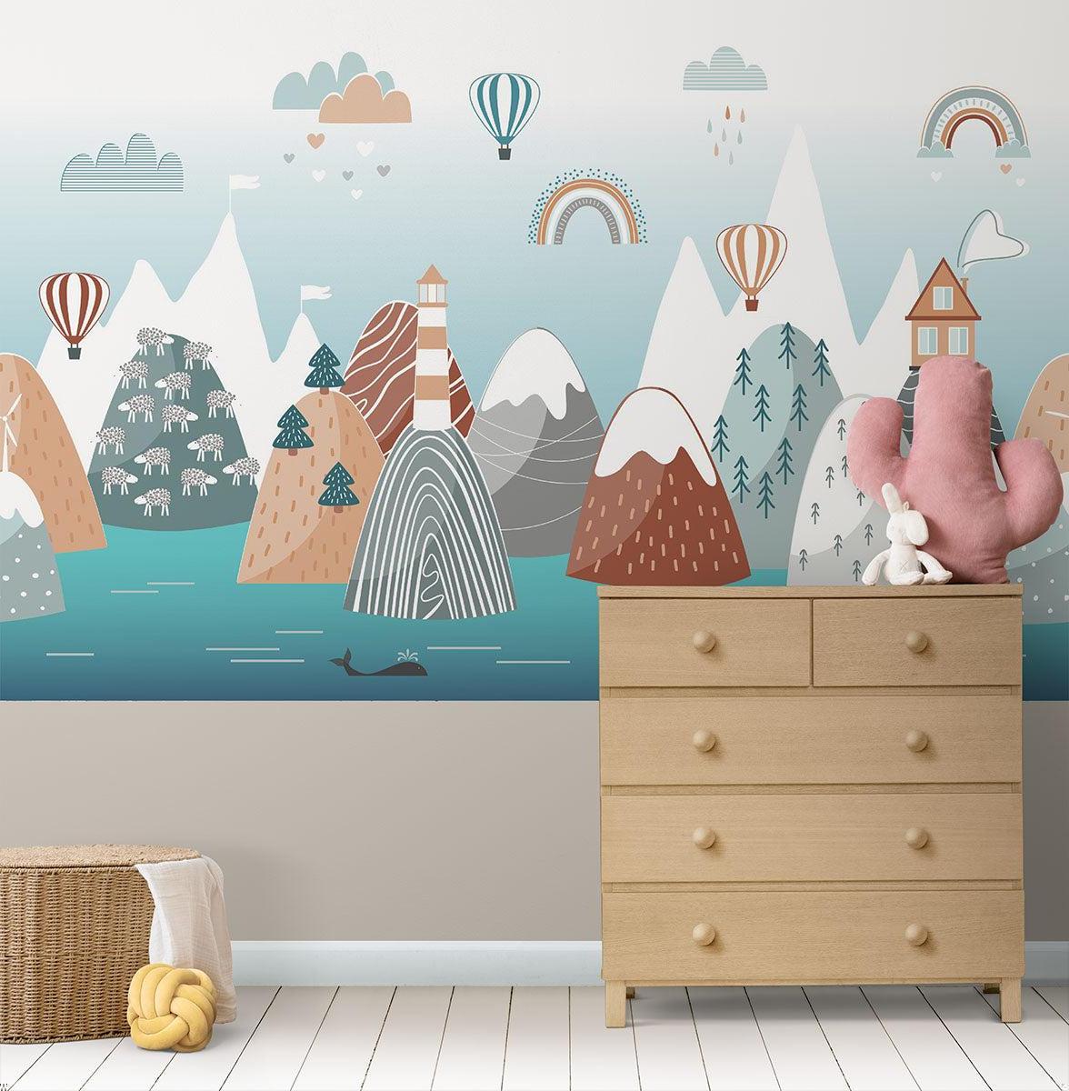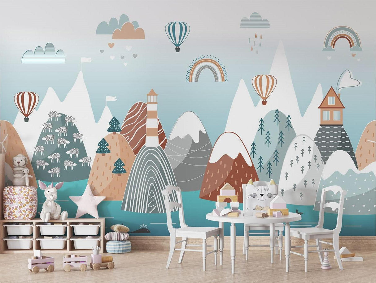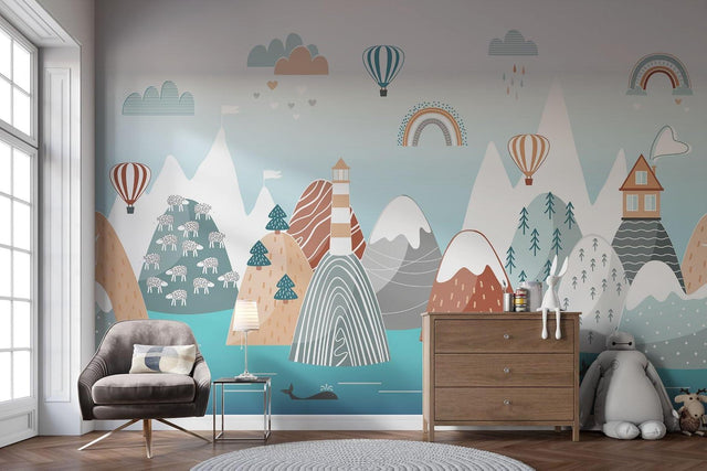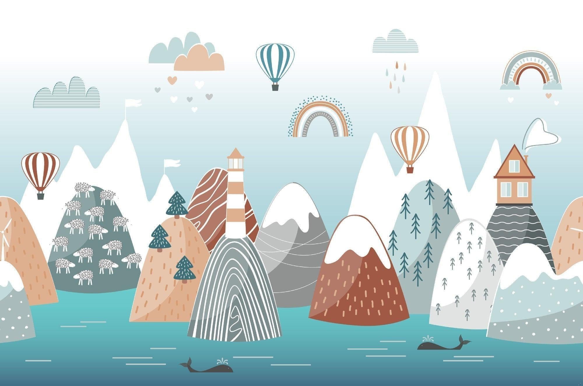 This enchanting mountain landscape wallpaper captures a whimsical adventure scene in soft, harmonious tones. Snow-capped peaks rise against a serene blue sky, while charming details like striped hot air balloons, gentle rainbows, and a lighthouse create a captivating narrative. The Scandinavian nursery wallpaper features a delightful mix of terracotta, teal, and pastel hues, with playful elements including pine forests, floating clouds, and a peaceful whale swimming in turquoise waters.