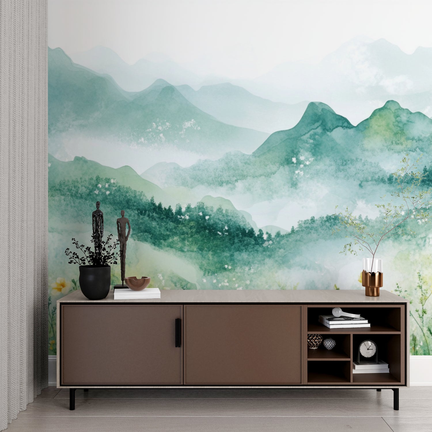 Our watercolor mountain mural adds instant depth to any wall.