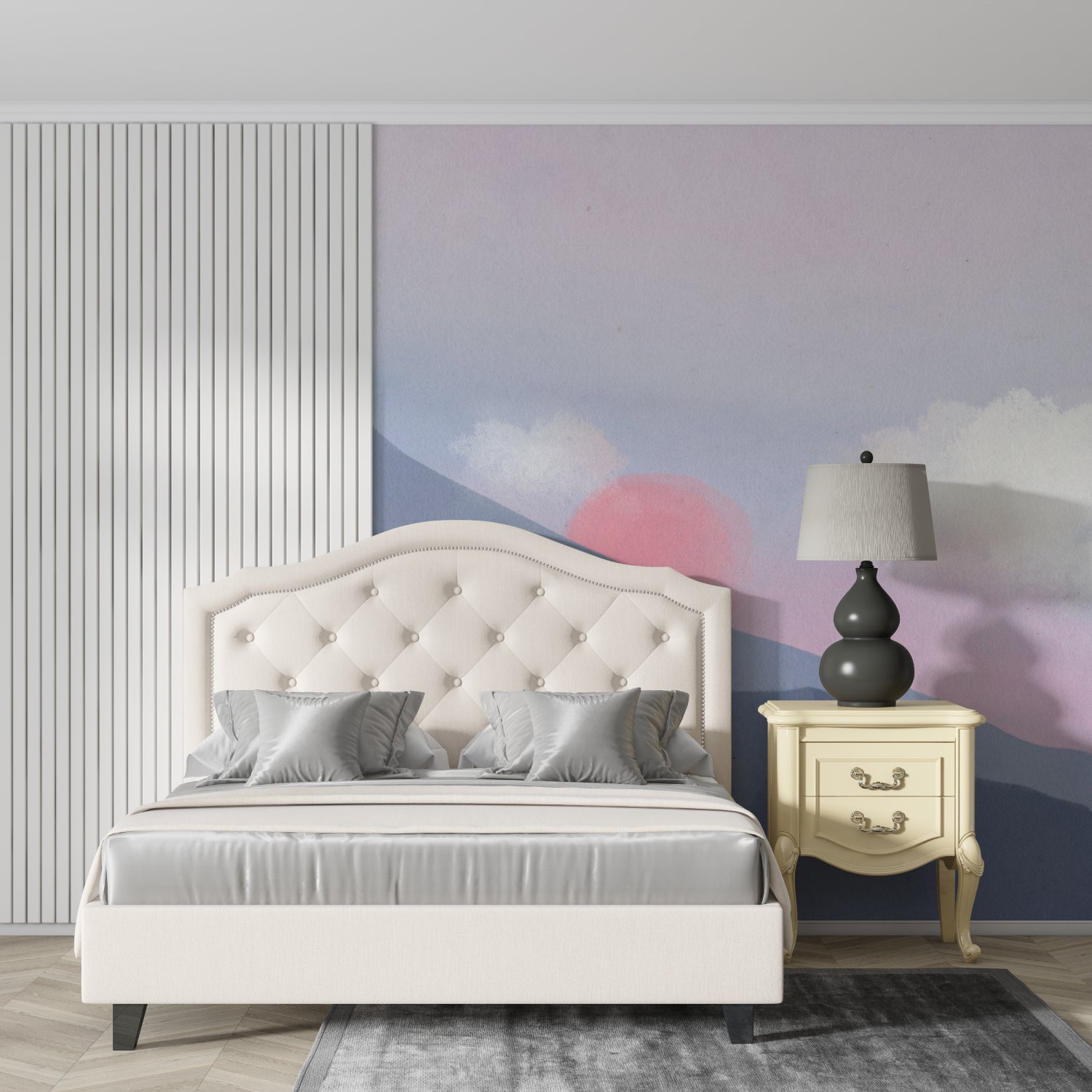This mountain landscape wallpaper captures the serene beauty of nature through a dreamy watercolor interpretation. Soft blue mountains rise against a gentle sky, while a coral-pink sun creates a mesmerizing focal point. Delicate white clouds drift across the scene, adding depth and movement to this scenic mountain mural, while subtle green foliage details bring a touch of natural vitality to the composition.