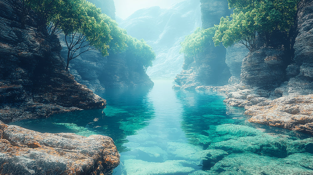 This canyon lake wallpaper captures a mesmerizing landscape where crystalline turquoise waters wind through majestic rocky cliffs. The scene depicts towering stone formations adorned with verdant trees, their foliage casting gentle shadows on the tranquil waters below. The mountain lake mural showcases nature's grandeur through its ethereal morning mist and the interplay of light on the crystal-clear waters.