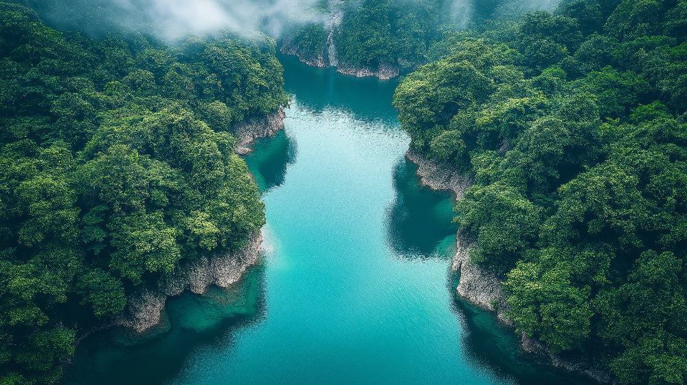This landscape mural wallpaper showcases a mesmerizing aerial view of a winding turquoise river cutting through dramatic forest-covered cliffs. The crystal-clear waters shimmer in ethereal blue-green hues, creating a striking contrast against the verdant canopy of trees. Wisps of mist hover above the forest landscape wallpaper, adding an element of mystery and depth to this captivating natural scene.