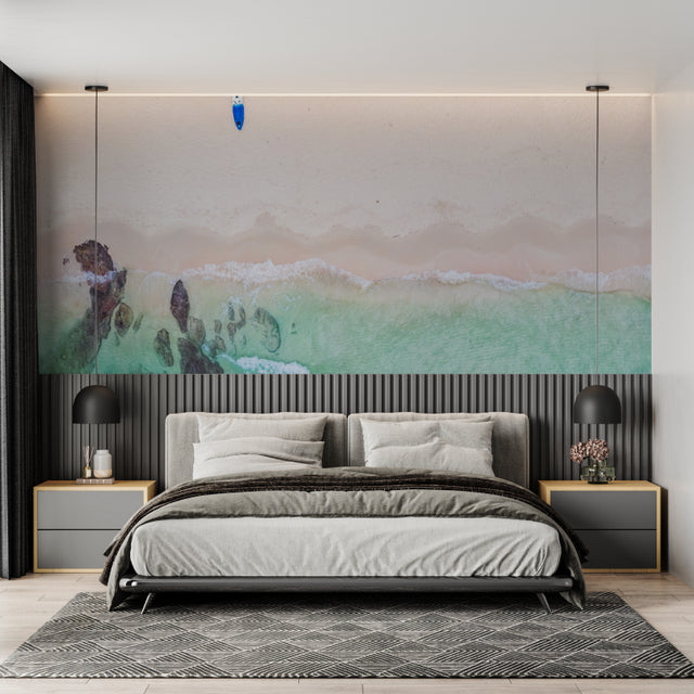 Ocean Mural Wallpaper | Aerial Beach View with Surfboard