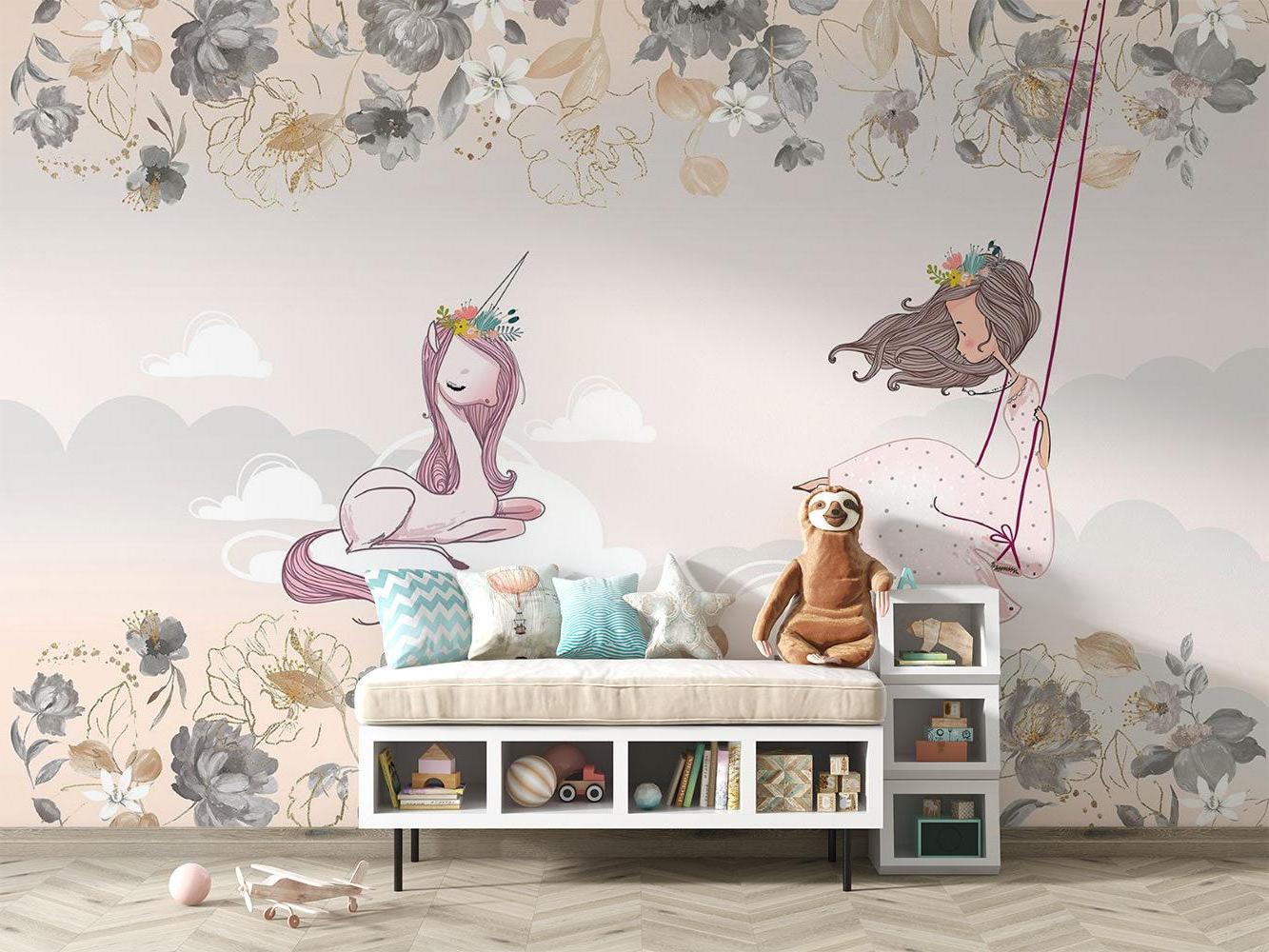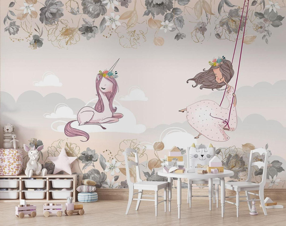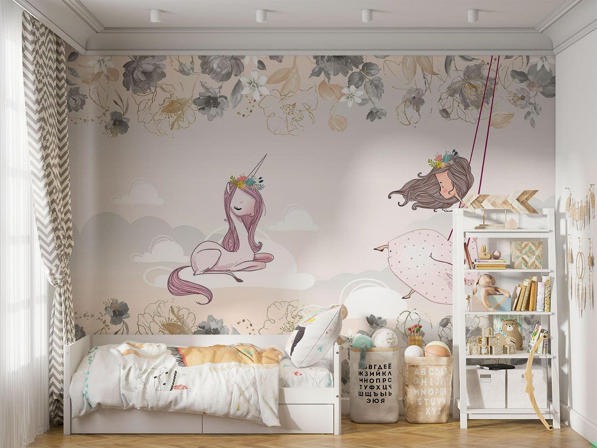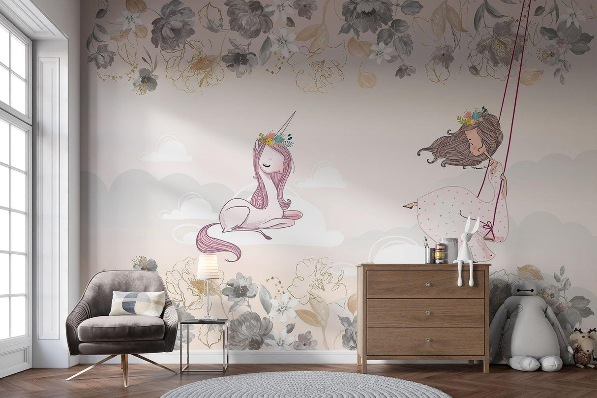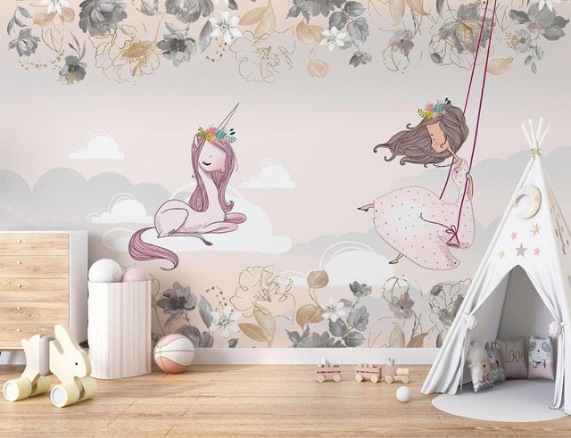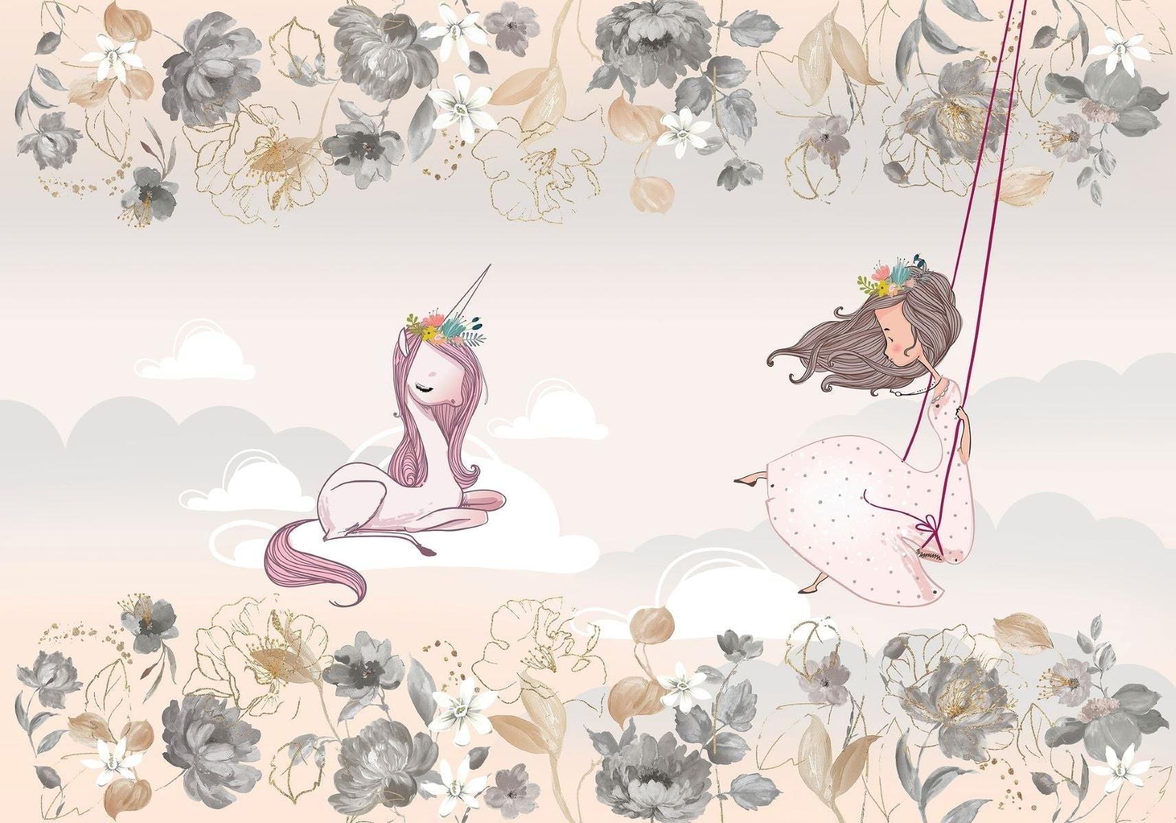 This enchanting princess wall mural showcases a delightful blend of whimsy and elegance. Set against a soft beige backdrop adorned with delicate grey and gold florals, the design features a graceful figure on a pink swing and a serene unicorn wallpaper design floating among gentle clouds. The artistic composition combines sophisticated watercolor elements with charming illustrations, creating a harmonious balance of fantasy and refinement.