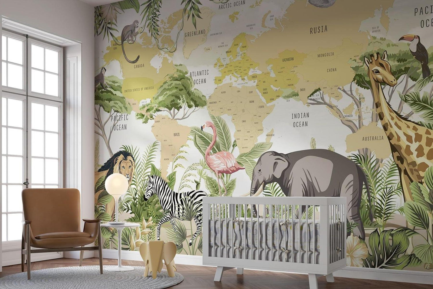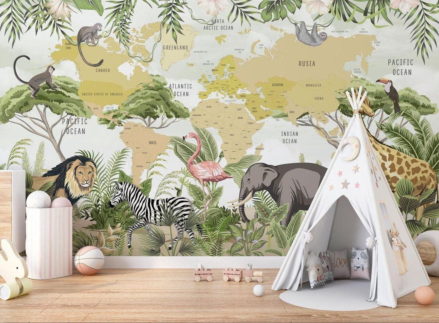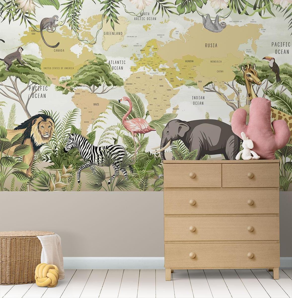 Safari Animals Mural Wallpaper | World Map with Jungle Wildlife