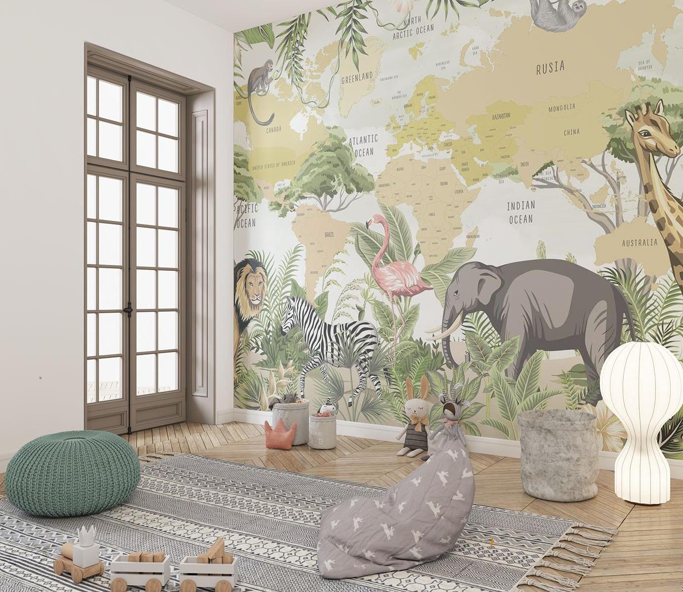Transform any space into an engaging learning environment with this educational world map mural. The jungle animals wallpaper creates an immersive atmosphere that sparks curiosity and imagination while maintaining a refined aesthetic suitable for nurseries, children's bedrooms, or playrooms. The careful balance of educational value and artistic design makes this mural a versatile choice that grows with your child, offering both decorative appeal and learning opportunities.