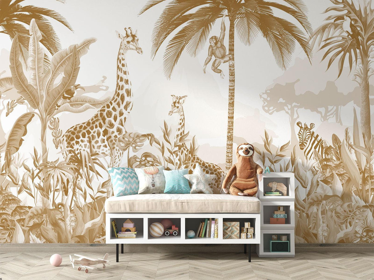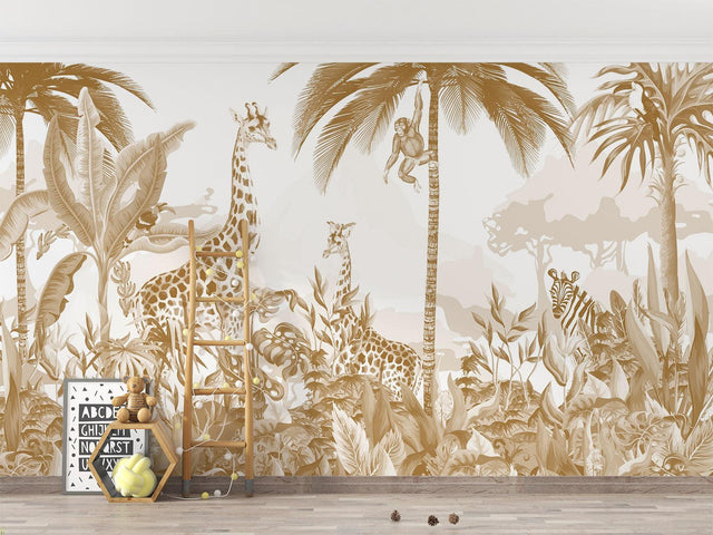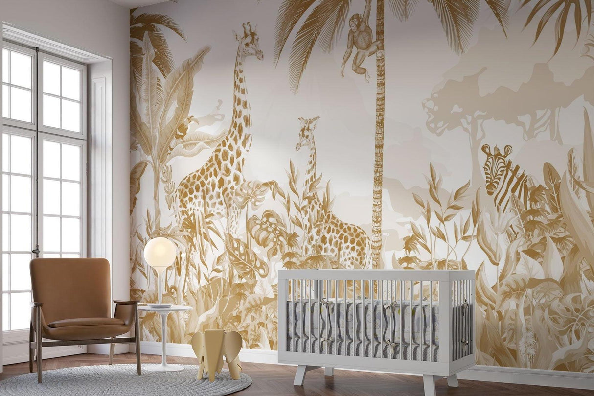 This enchanting safari wallpaper brings the magic of a sun-drenched African landscape into your space. Rendered in sophisticated golden hues, the detailed illustration features majestic giraffes, playful monkeys swinging from palm trees, and watchful zebras amid lush tropical foliage. The jungle animals wallpaper creates a dreamy, artistic atmosphere with its delicate brushwork and harmonious beige-and-gold palette, offering a refined take on wildlife imagery.