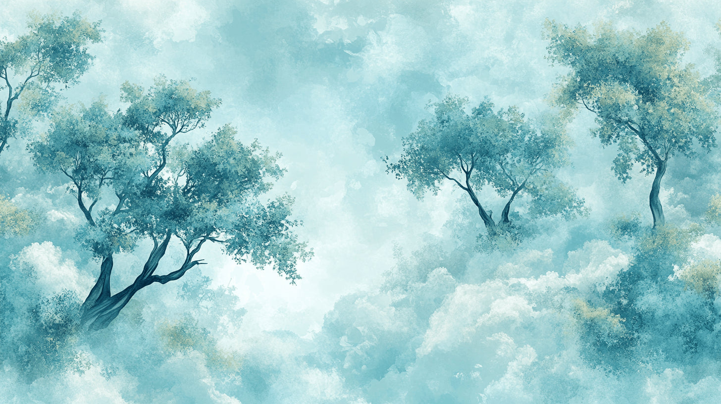 This tree wallpaper mural captures the ethereal beauty of nature with its graceful branches reaching across a soft, misty blue sky. The watercolor-like technique creates depth through varying shades of turquoise and azure, while delicate tree silhouettes dance against billowing clouds. The artistic composition brings a sense of movement and tranquility, offering a harmonious blend of nature's elements in a sophisticated design.
