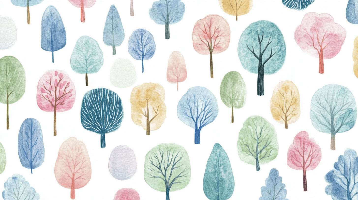 This enchanting forest wallpaper showcases a delightful collection of watercolor trees in soft, soothing pastels. Each tree is uniquely rendered with gentle brushstrokes in calming shades of blue, mint green, coral pink, and warm yellow against a pristine white background. The tree pattern wallpaper creates a rhythmic arrangement that brings a sense of natural harmony and artistic sophistication to any space.