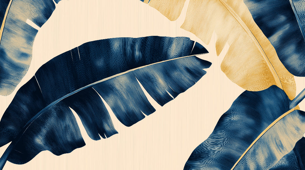 This tropical banana leaf wallpaper showcases a dramatic interplay of oversized foliage in deep navy blue and luminous gold. Each leaf is rendered with exceptional detail, featuring a textured, artistic quality that creates depth and movement across the design. The botanical wall mural stands out beautifully against its cream-colored backdrop, offering a sophisticated take on tropical decor that bridges contemporary and natural aesthetics.