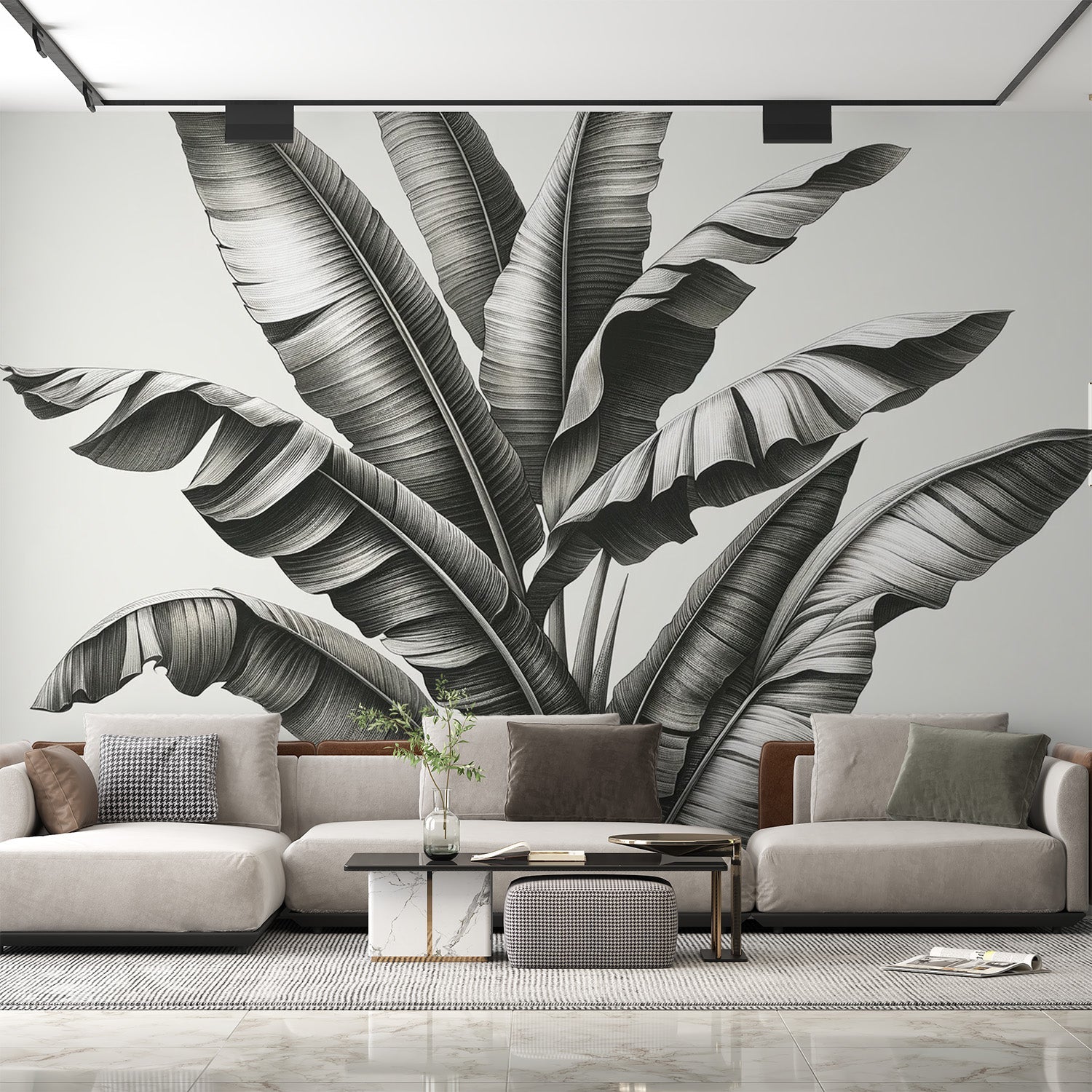 Transform your space with this modern botanical mural that brings architectural presence to any interior. The large-scale leaf pattern creates an immersive atmosphere while maintaining an air of refined elegance. Perfect for contemporary spaces seeking to make a statement through minimalist design, this wallpaper adds depth and visual interest while complementing a variety of interior styles and color schemes.