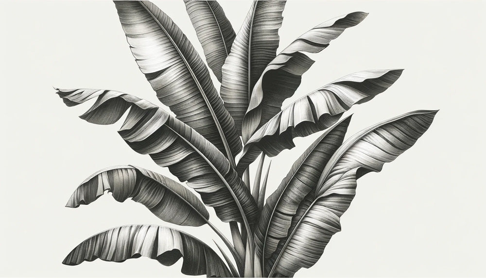 This tropical leaf wallpaper showcases a striking monochromatic composition of majestic banana leaves rendered in precise detail. The masterfully drawn foliage creates a bold artistic statement, with each leaf displaying intricate textures and gradients from light to dark. The black and white botanical wallpaper captures the natural grace and movement of the leaves against a clean, light background, offering both dramatic impact and sophisticated restraint.