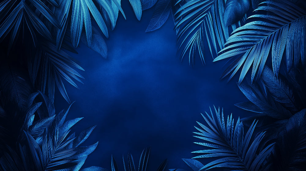 This tropical palm wallpaper showcases an elegant arrangement of crystalline blue foliage against a rich midnight-blue backdrop. The oversized palm fronds create a sophisticated frame effect, with their detailed veining and layered composition bringing depth and dimension to the design. The blue tropical wallpaper exhibits a mesmerizing interplay of azure and cerulean tones, creating a sense of mystery and tranquility.