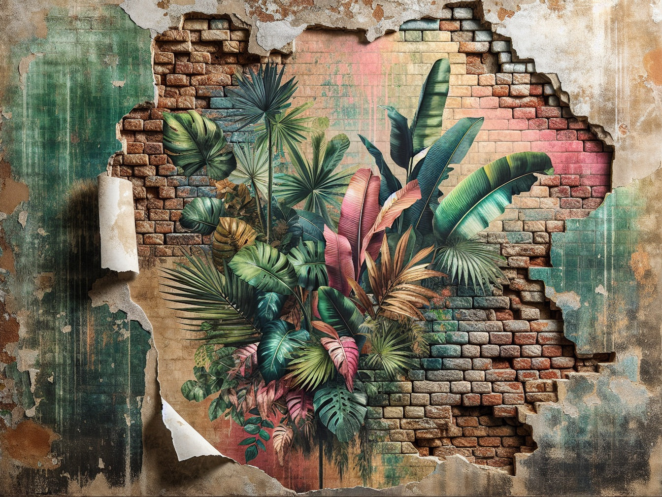 Transform your space with this urban tropical wallpaper that bridges the gap between industrial architecture and natural beauty. The botanical brick wall mural creates an immersive atmosphere perfect for modern interiors seeking to combine raw urban elements with organic vitality. The distressed wall effect and vintage-inspired color palette add depth and character, making this design particularly striking in contemporary living spaces, creative offices, or atmospheric dining areas.