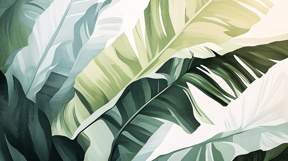This tropical leaf wallpaper showcases majestic banana leaves rendered in a sophisticated palette of deep forest greens, soft sage, and subtle blue-green tones. The oversized botanical wall mural creates a striking artistic statement with its photorealistic detail and painterly brushstrokes, capturing the natural grace and grandeur of tropical foliage against a crisp white background. Each leaf appears to emerge from the wall with remarkable depth and dimension, creating an engaging interplay of light and shadow.