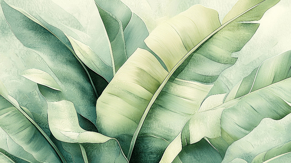 This tropical leaf wallpaper showcases an artistic interpretation of majestic banana leaves rendered in sophisticated shades of sage and mint green. The oversized botanical design features detailed leaf textures and graceful curves, creating a sense of depth through masterful light and shadow play. Each banana leaf mural is artfully composed against a soft, misty background, offering a contemporary take on classic tropical motifs.
